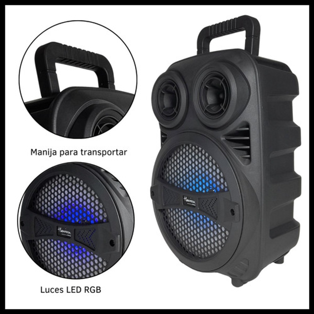 Características: -Batería interna recargable. -Incluye luces LED RGB. -Entrada USB/SD/AUX. -Potencia de salida: 250W. -Voltaje: 5V.
