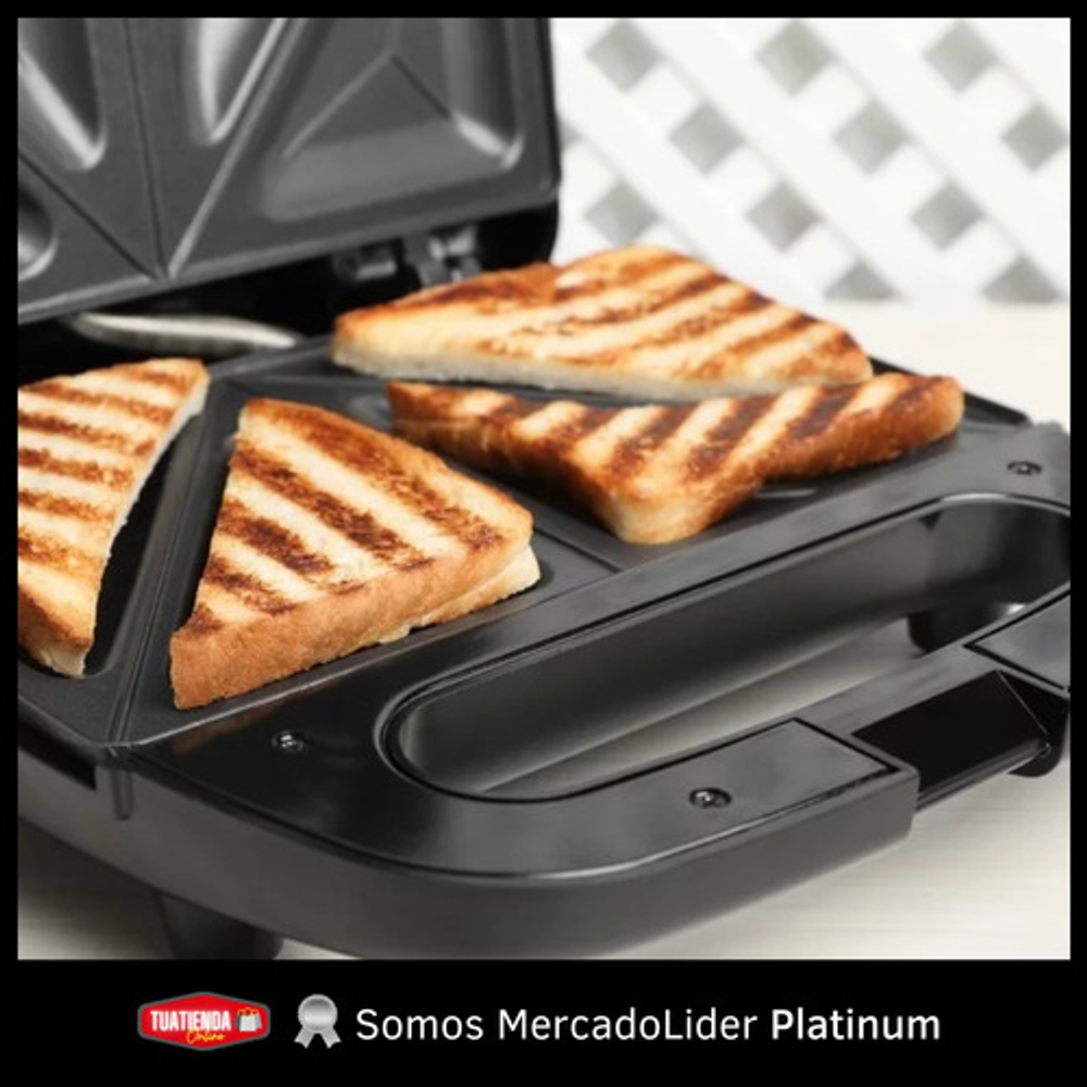 Características de la cafetera: • Potencia: 700W. • Placas antiadherentes. • Base antideslizante. • Capacidad para dos tostados. • Traba de seguridad. • Luces indicadoras de uso.