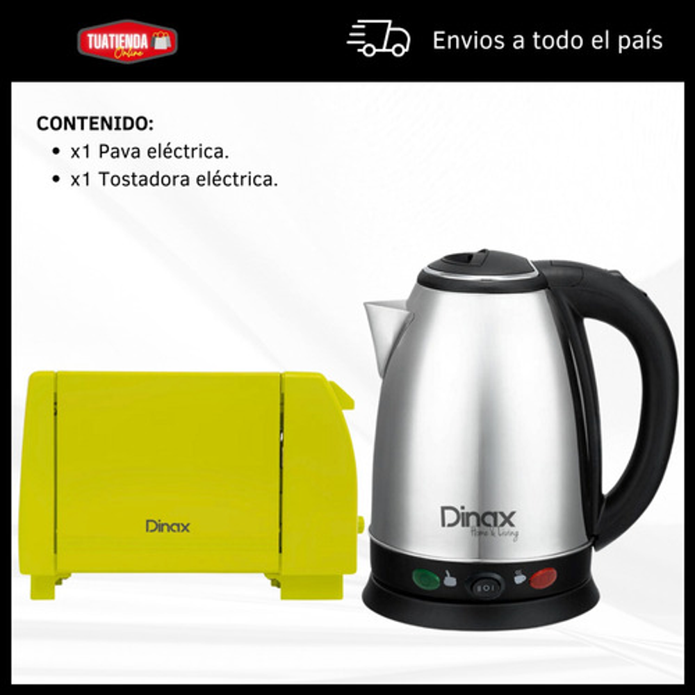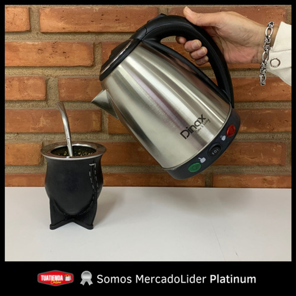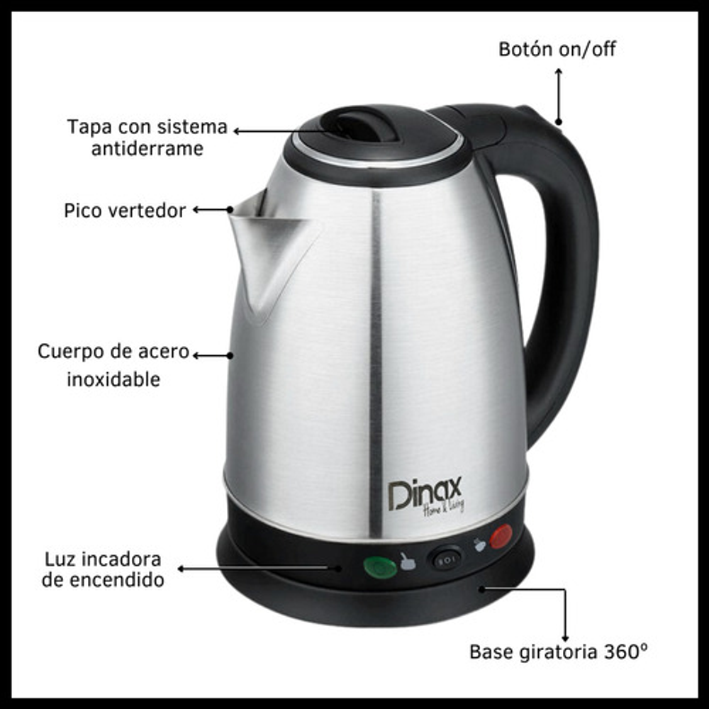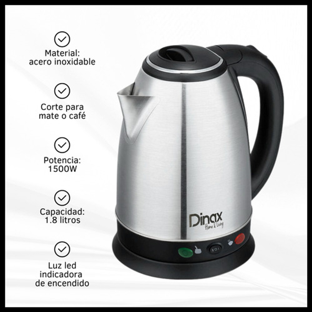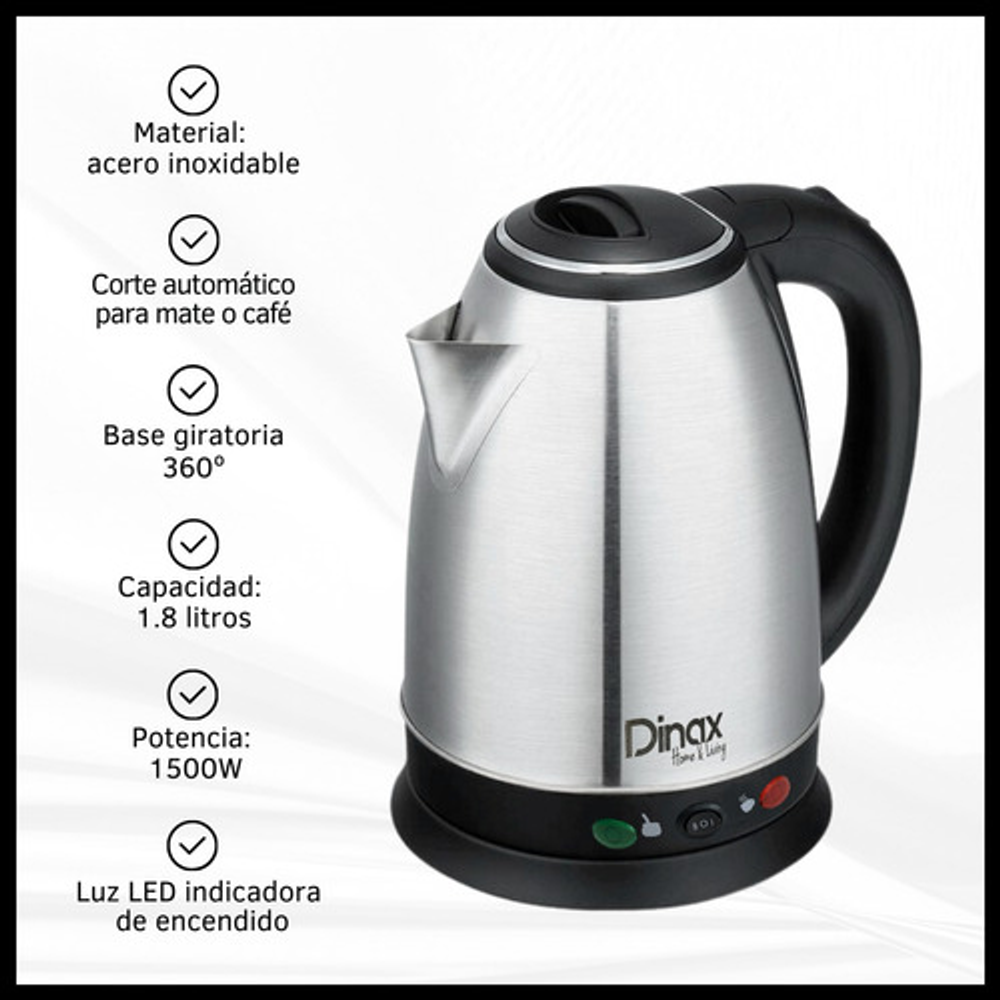Características de la pava: -Tiene dos temperaturas: mate o café. -Luz indicadora de encendido. -Material: acero inoxidable. -Base giratoria 360°. -Corte automático. -Potencia: 1500W. -Capacidad: 1.8 lts.