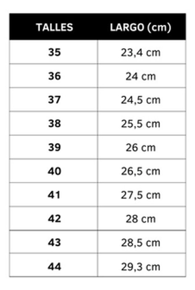 Talles: Por favor consultar la tabla de talles que se encuentra en las imágenes del producto. Se recomienda sumar 0,5cm al largo total del pie para obtener una mejor comodidad.