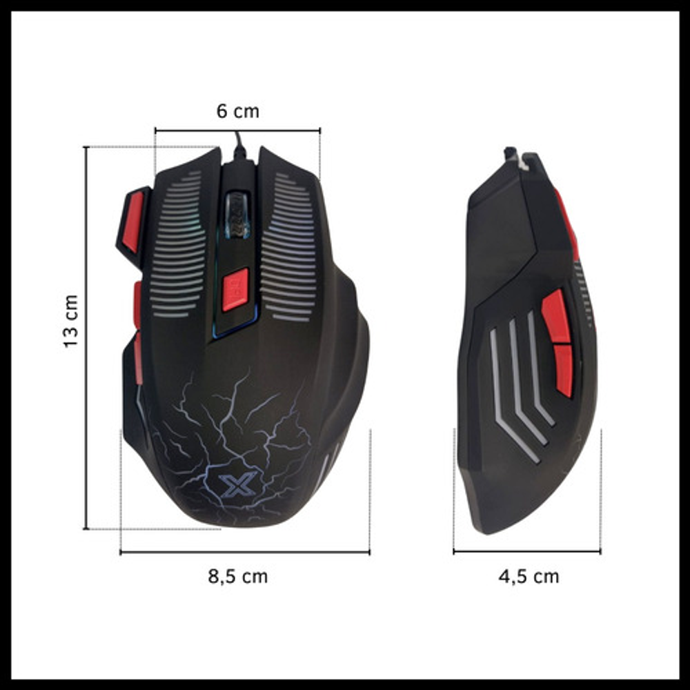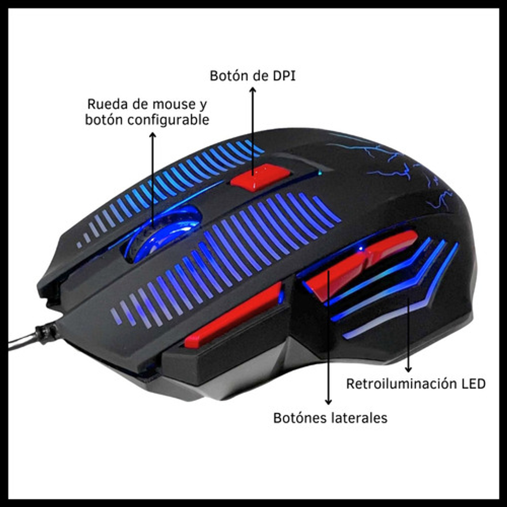 Características: -DPI: 800 - 1200 - 1600 - 2400 -Largo del cable: 1,5 metros -Botones programables -Aceleración: 8G -Es ambidiestro -Conexión USB