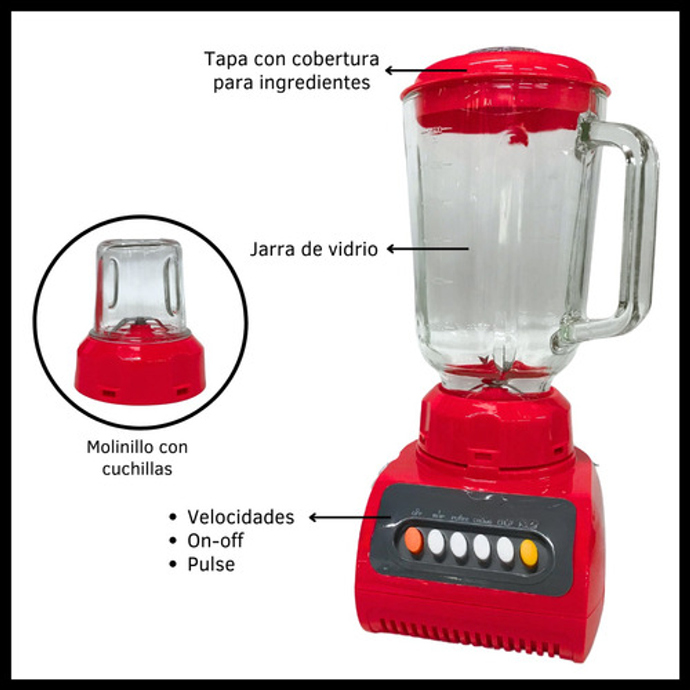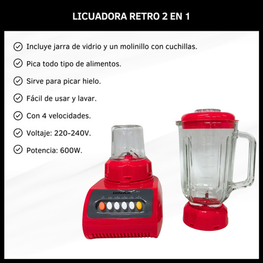 Licuadora 2 en 1 con jarra de vidrio de 1,5 litros, diseñada para adaptarse a todas tus necesidades culinarias. Este electrodoméstico multifuncional no solo licua, sino que también muele y pica, lo que te permite crear una variedad de preparaciones como salsas, licuados, dips, smoothies saludables y cremas. Cuenta con una función especial para picar hielo, ideal para preparar bebidas frías rápidamente. Opera a un voltaje de 220-240 y tiene una potencia de 600W. Incluye molinillo.