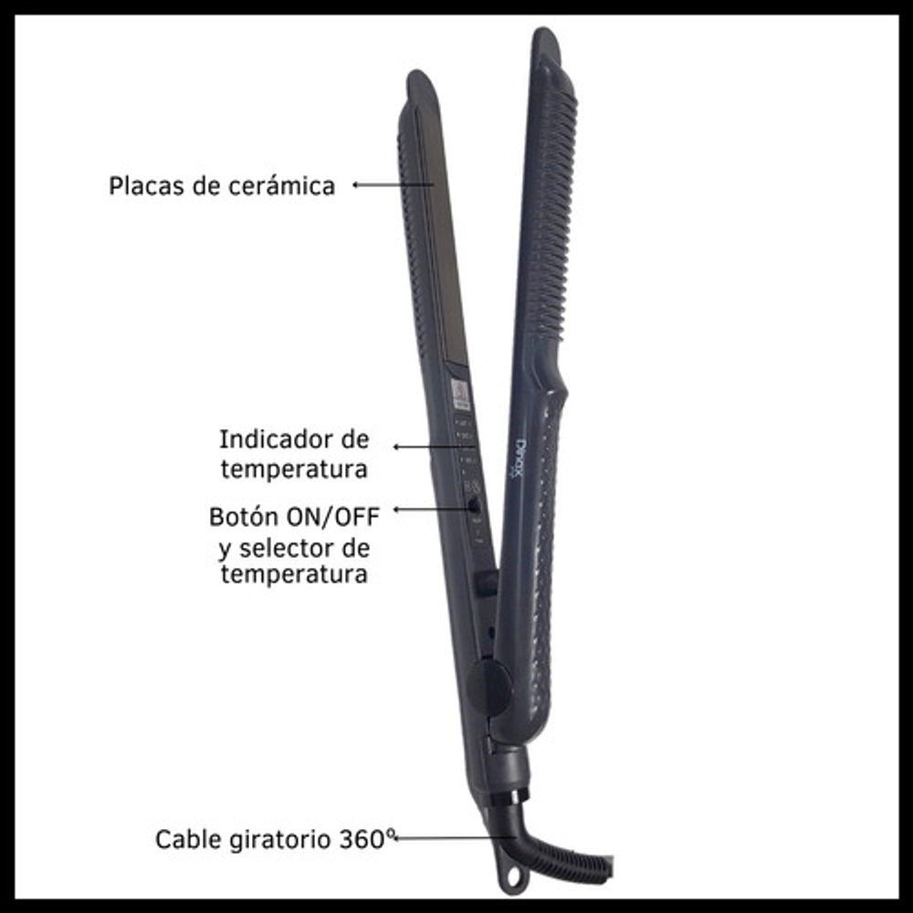 Características planchitas de pelo: • Placas de cerámica. • Voltaje: 220-240V. • Cable giratorio 360º. • Potencia de 40W. • Temperaturas: 180ºC, 200ºC, 220ºC y 240ºC.