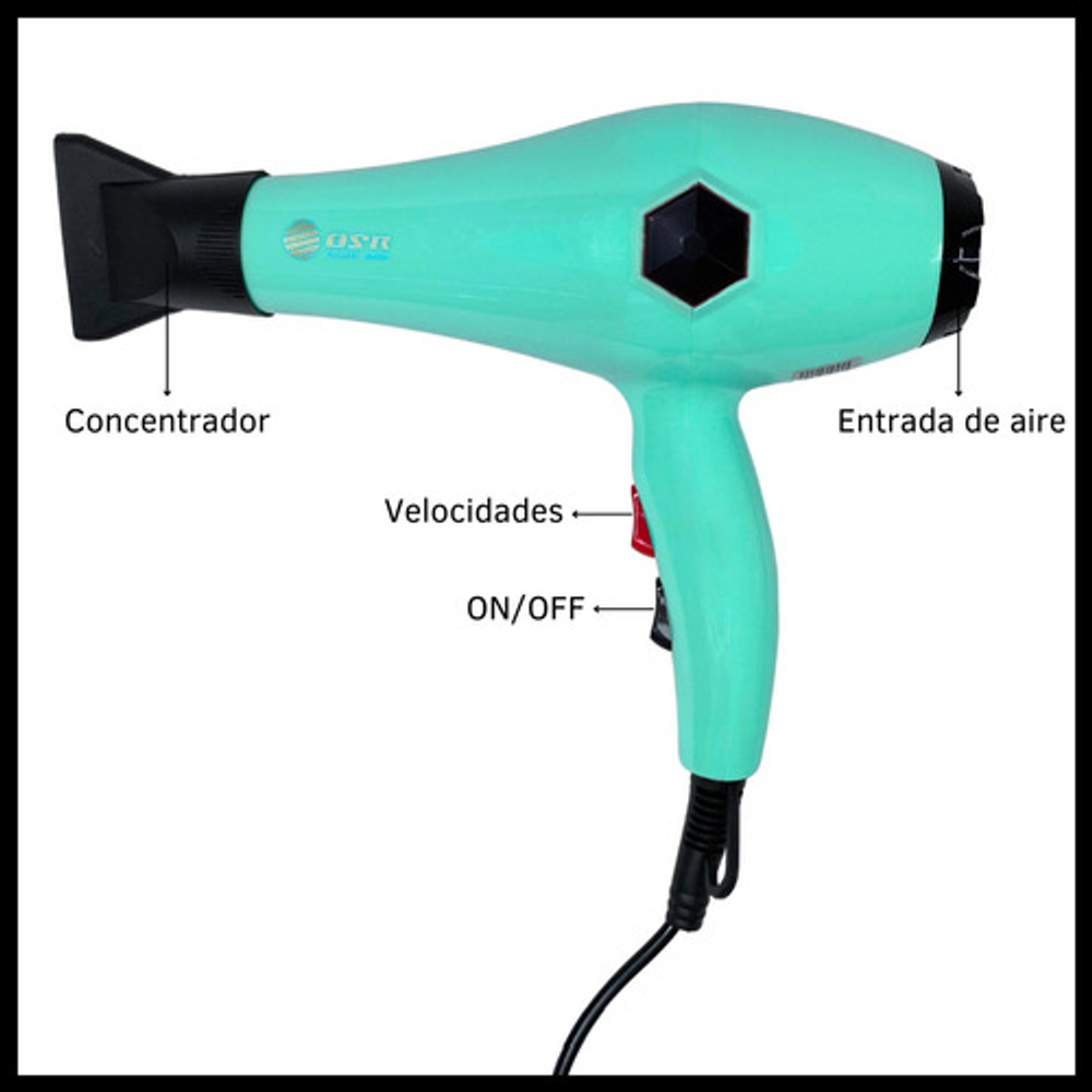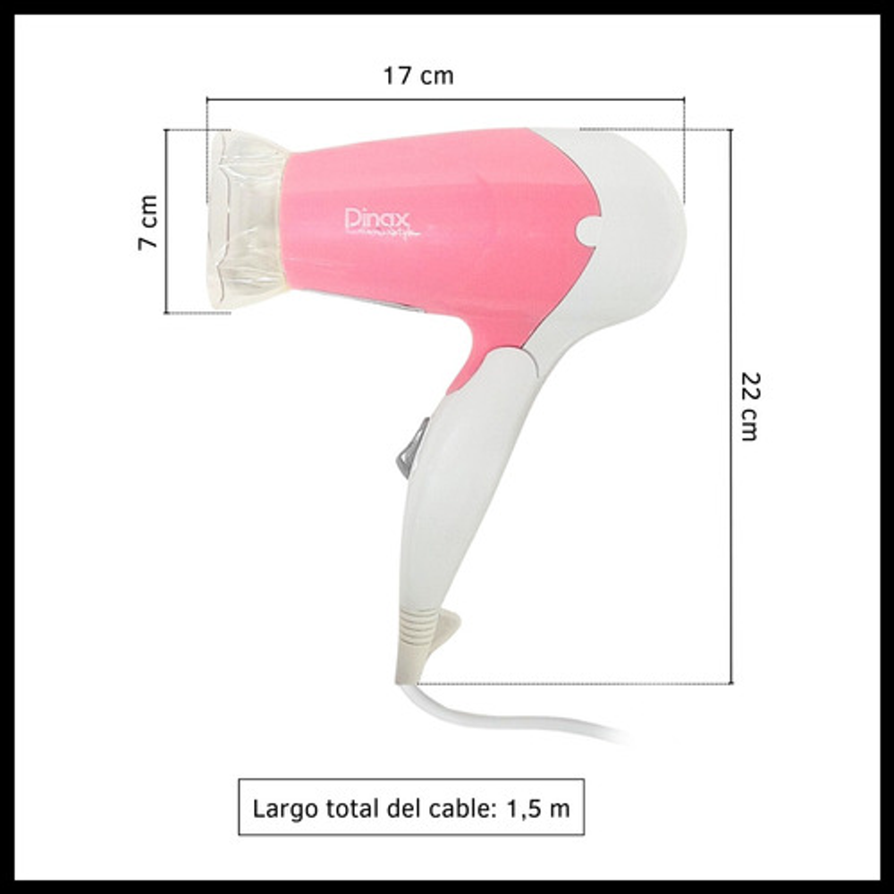 Características secador de pelo: • Temperatura máxima de 110º. • Plástico super resistente. • 1400 W de potencia. • 2 niveles de calor. • Super liviano. • Plegable.