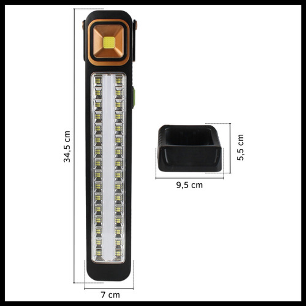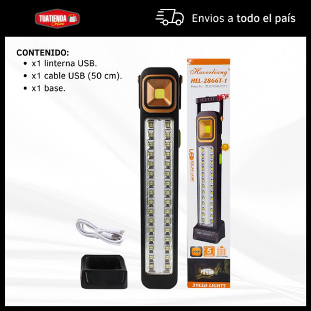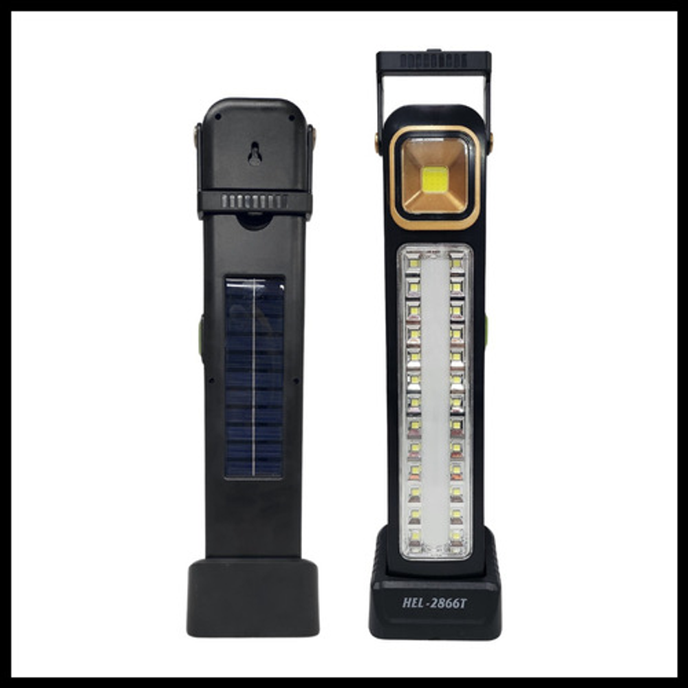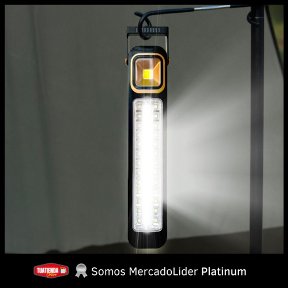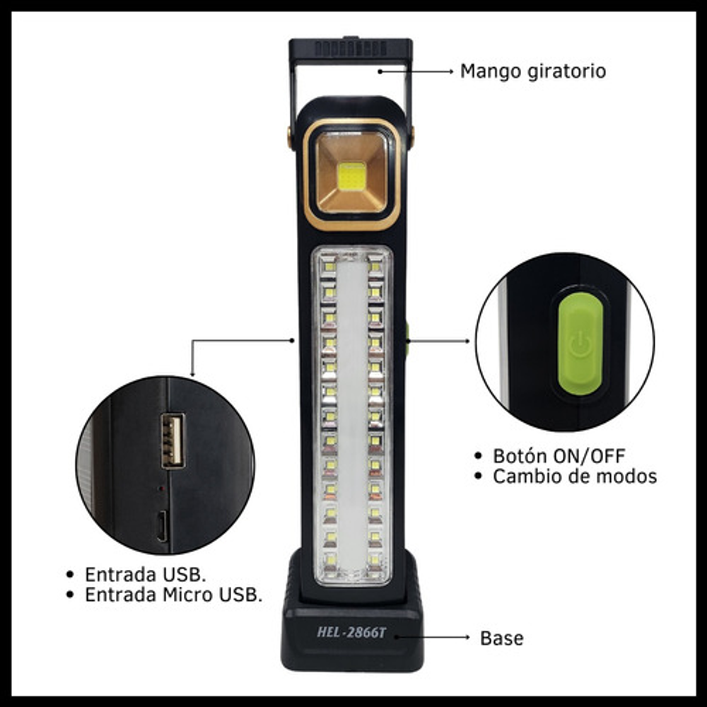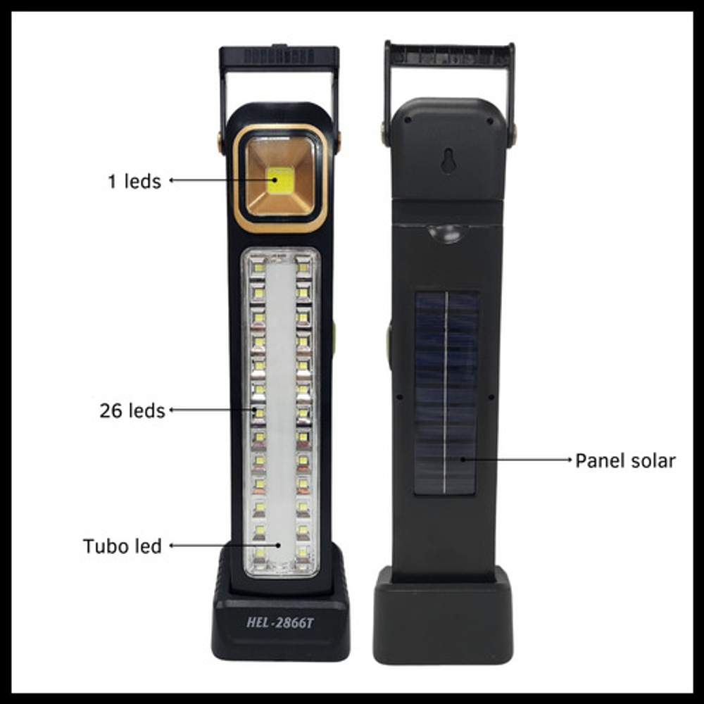 Características: • Potencia: 30W. • Base desmontable. • Luz LED blanca fría. • Material de plástico. • 26 leds de alto brillo. • Mango giratorio 320°. • 5 niveles de intensidad. • Carga USB o carga solar. • Batería de litio recargable. • Funciona como luz de emergencia. • Ideal para llevar a días de pesca, camping, caza.