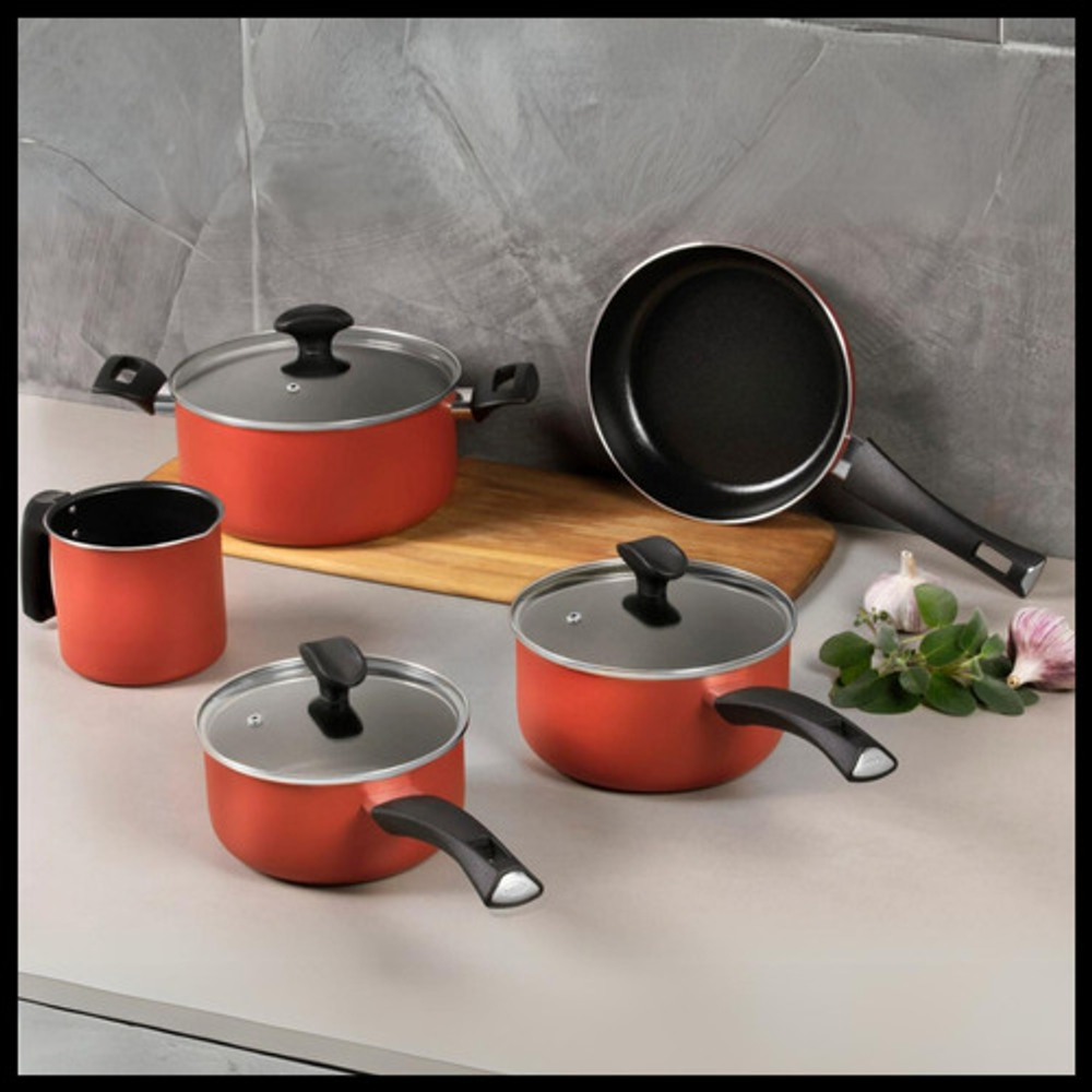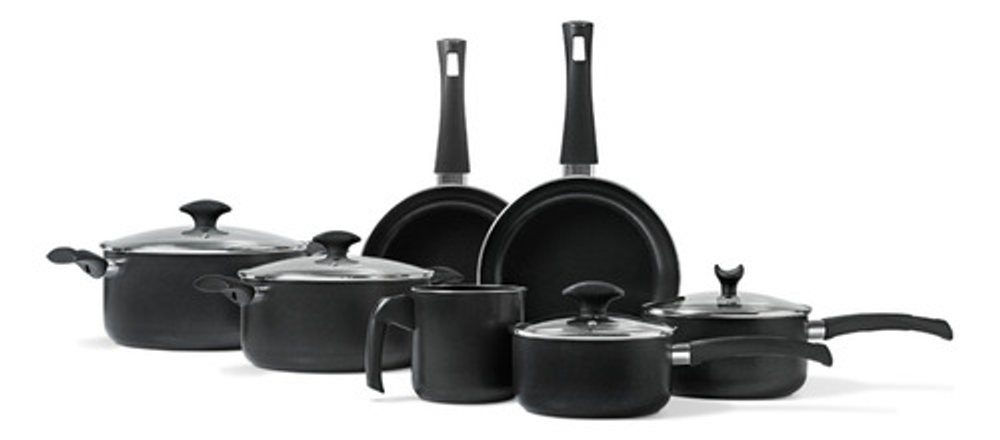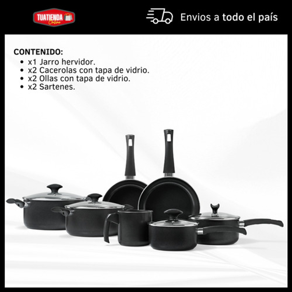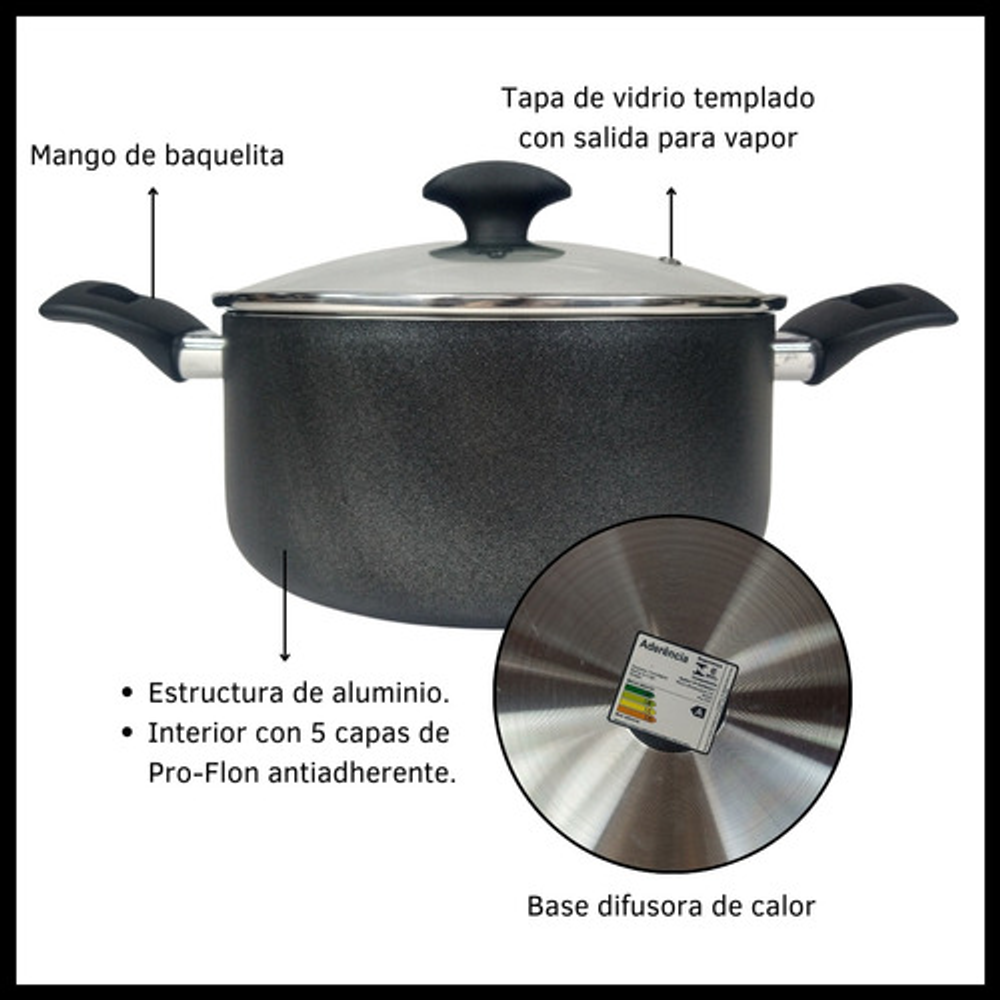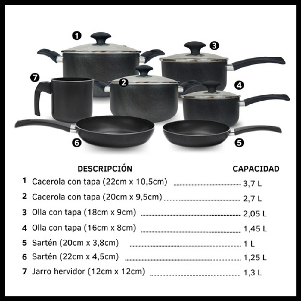 Características: • Incluye: x2 Cacerolas con tapa de vidrio, x2 Ollas con tapa de vidrio, x2 Sartenes y x1 Jarro hervidor. • Todas las piezas tienen las mismas características. • Capacidad y tamaño de cada olla especificado en la foto 4. • Material exterior de las piezas: aluminio. • Interior con 5 capas de Pro-Flon antiadherente. • Mango de baquelita antitérmico. • Base difusora de calor. • Apto para lavavajillas. • Espesor: 2,5mm • Libres de PFOA.
