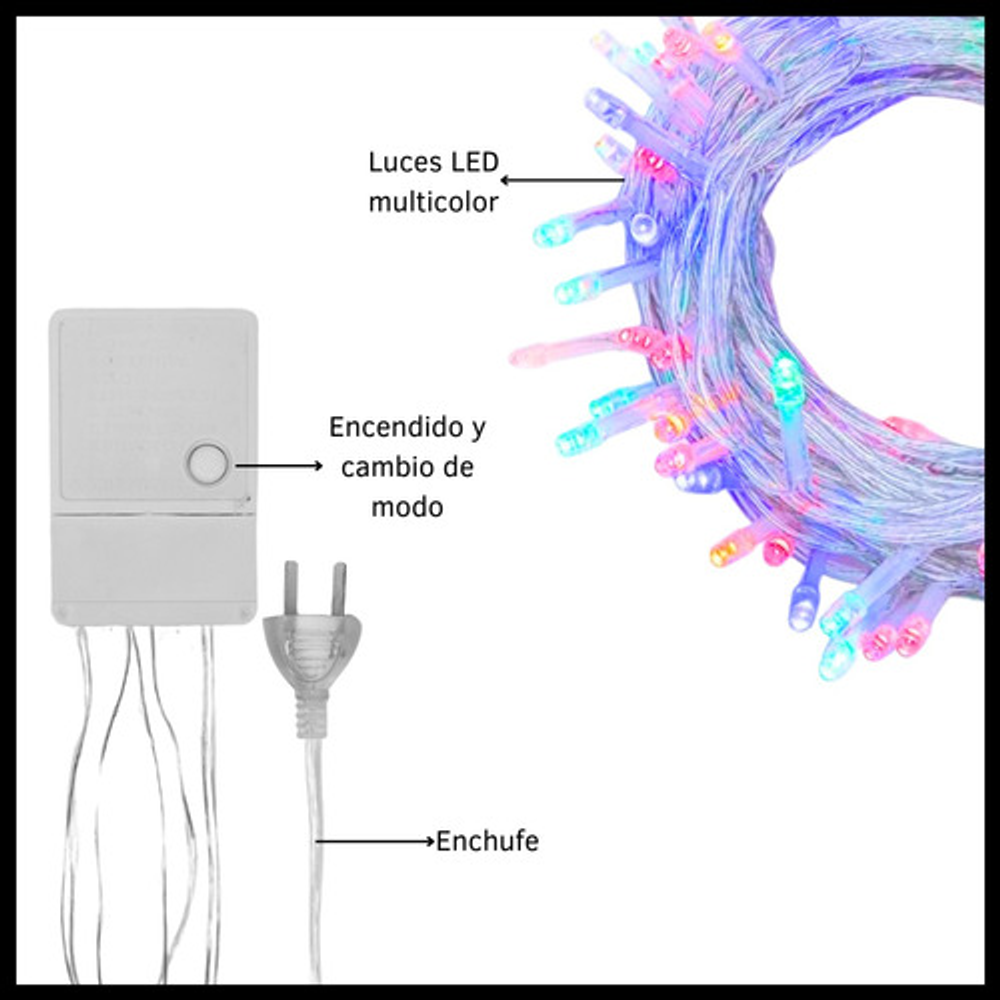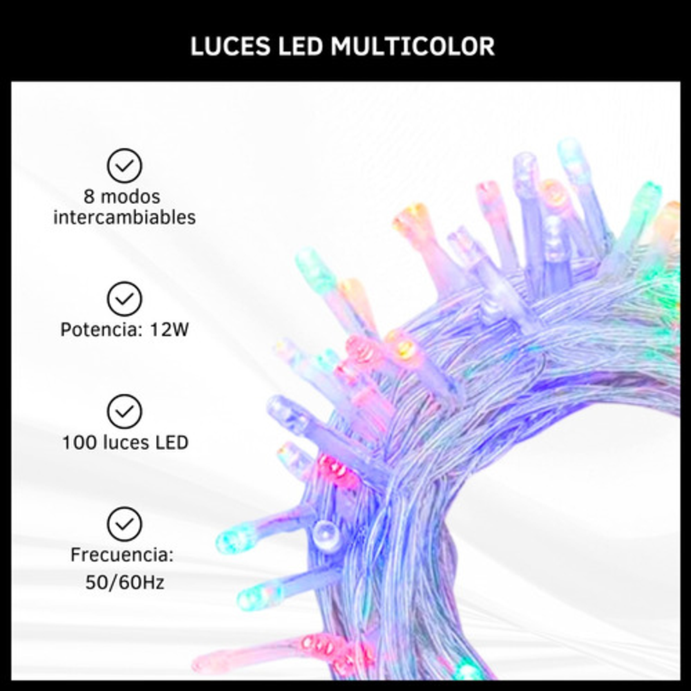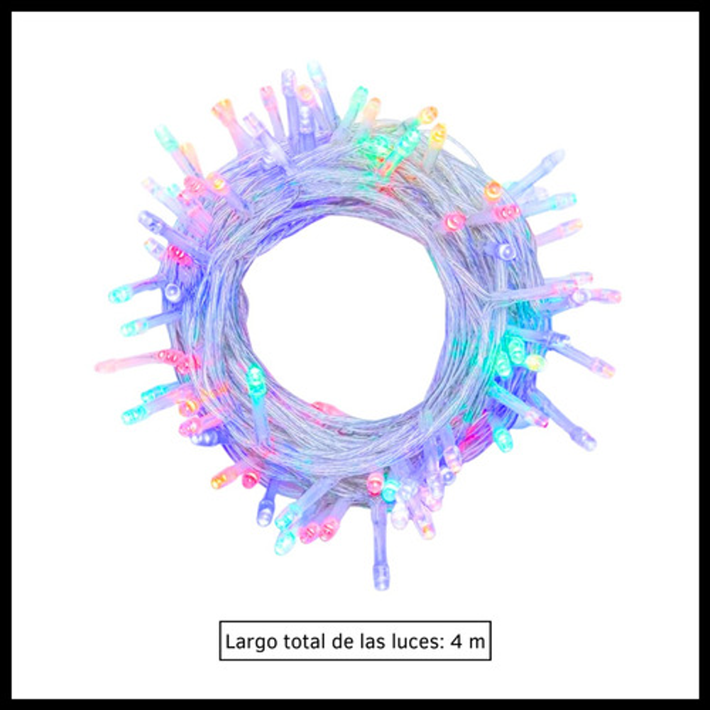 Características: • 8 modos intercambiables. • 100 luces LED multicolor. • Frecuencia: 50/60Hz. • Largo total: 4 metros. • Potencia: 12W.