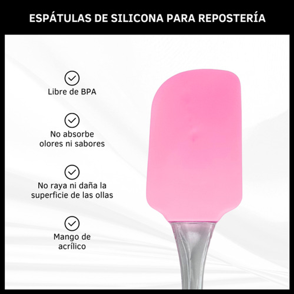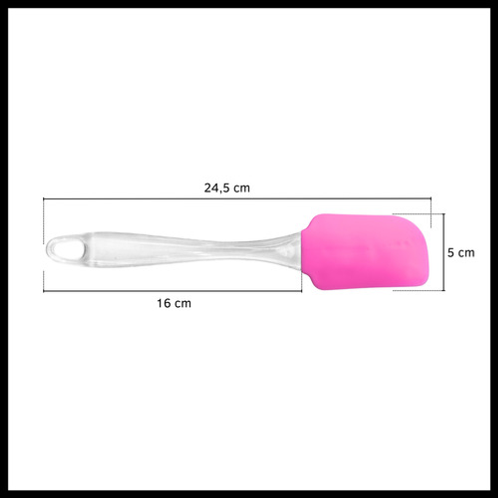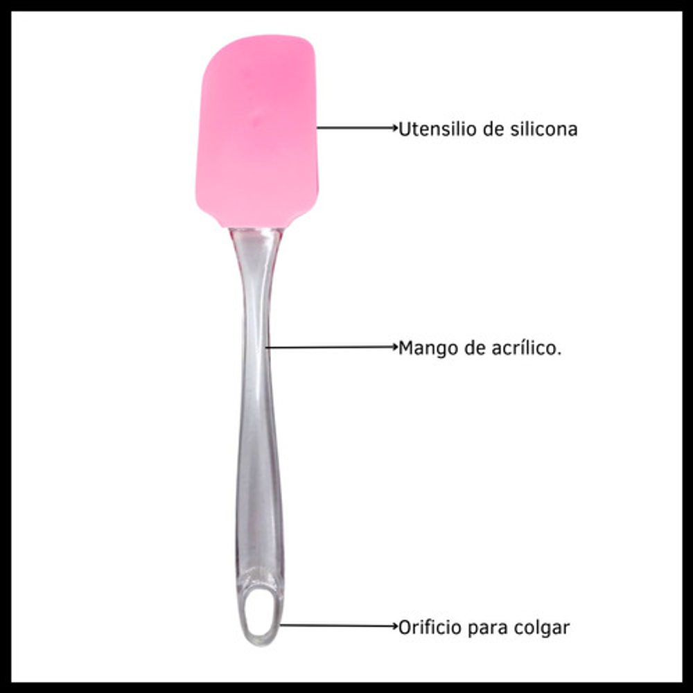 Características: • Silicona flexible para raspar los bordes sin dañar los recipientes. • No raya ni daña la superficie de las ollas. • No absorbe olores ni sabores. • Incluye orificio para colgar. • Mango de acrílico. • Libre de BPA • Los colores están sujetos a stock.