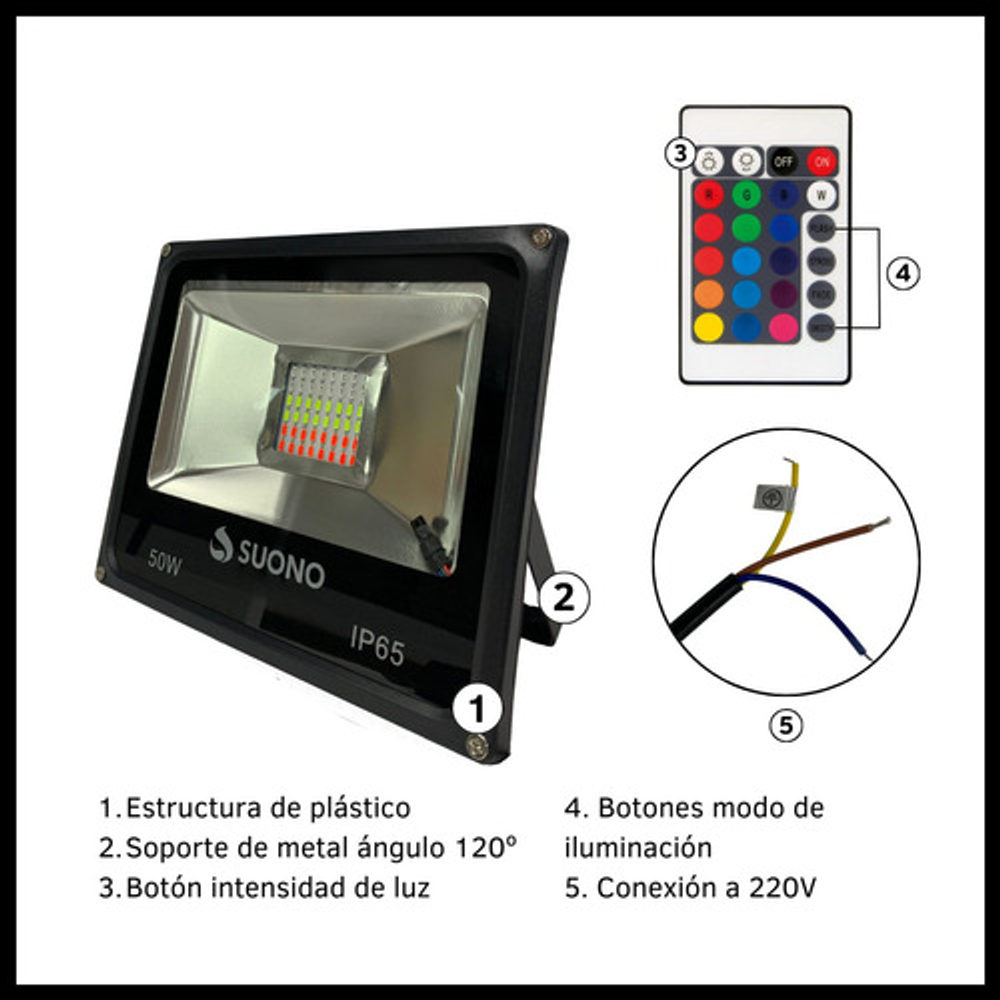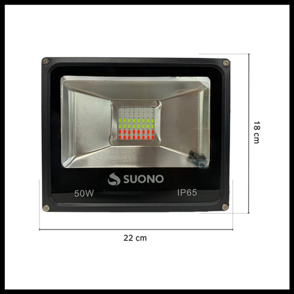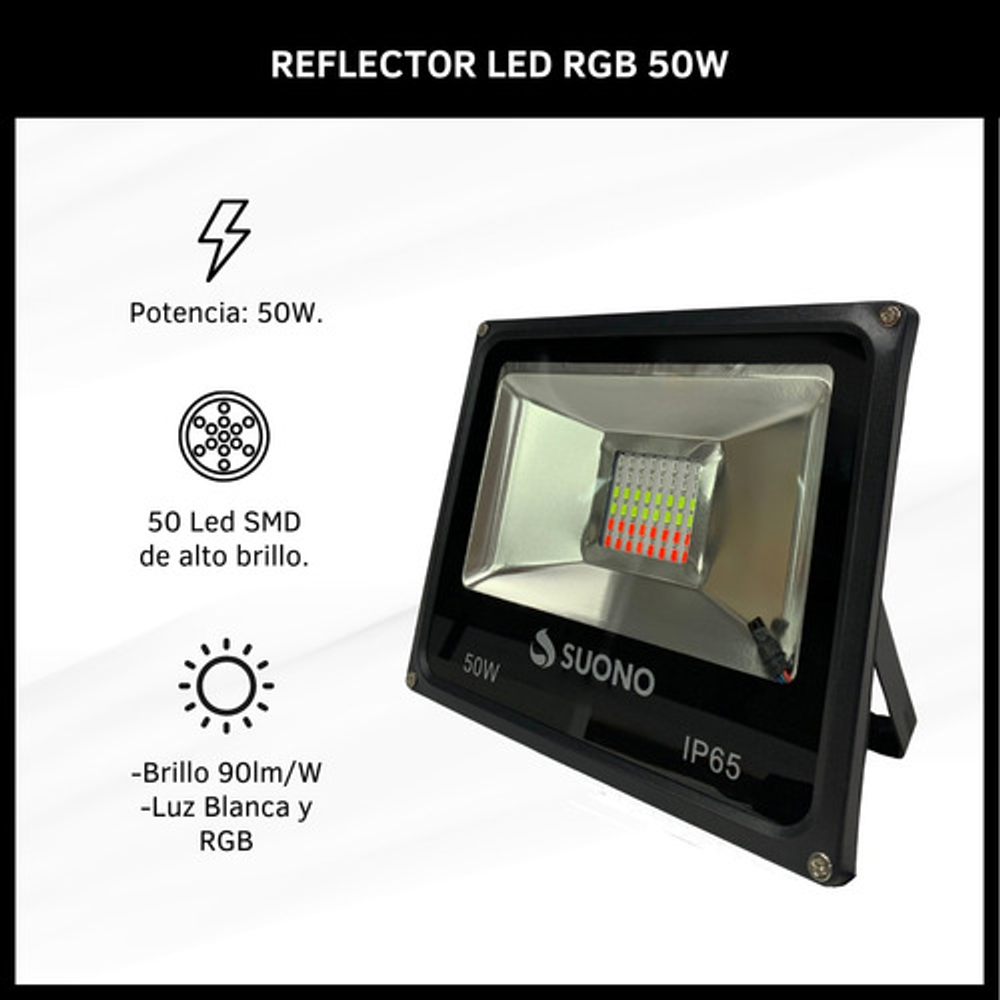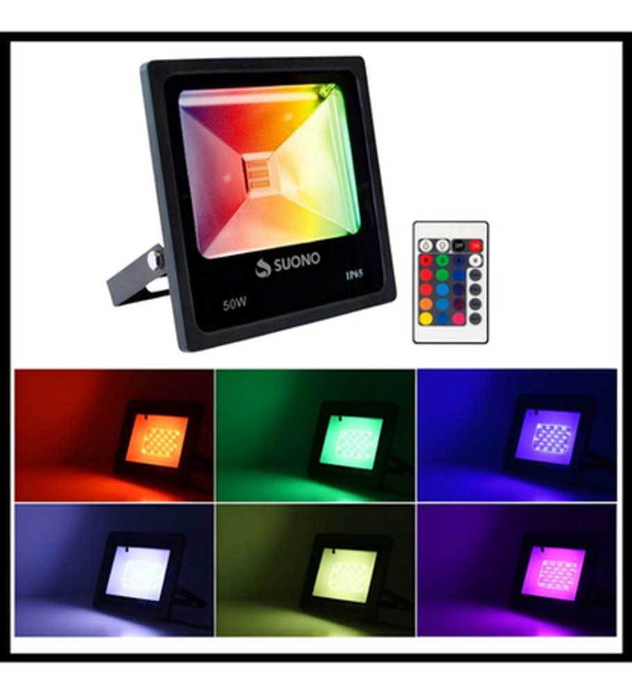 Características: -Vida útil 50.000hs. -Corriente de Entrada: 220V -Color de la carcasa: Negro -Potencia: 50 Watts -Color de la Luz: 16 Colores RGB - Con control remoto -Apto para Exteriores (No es sumergible) -Angulo de apertura del soporte 120° -Medidas: 18 x 22 x 13 cm