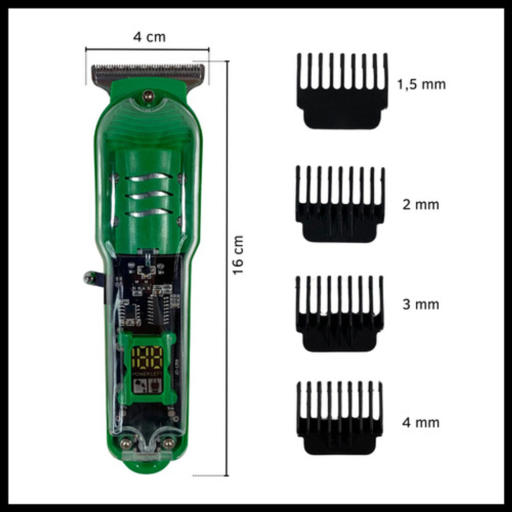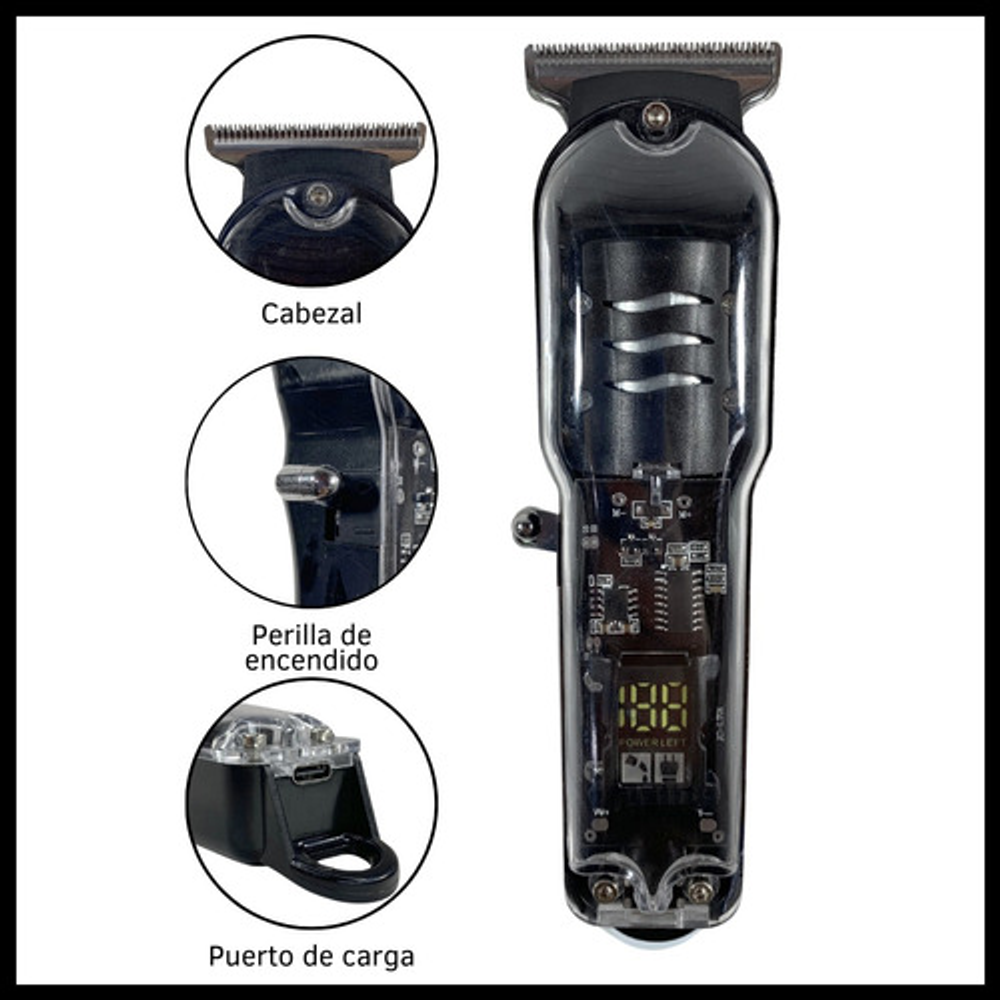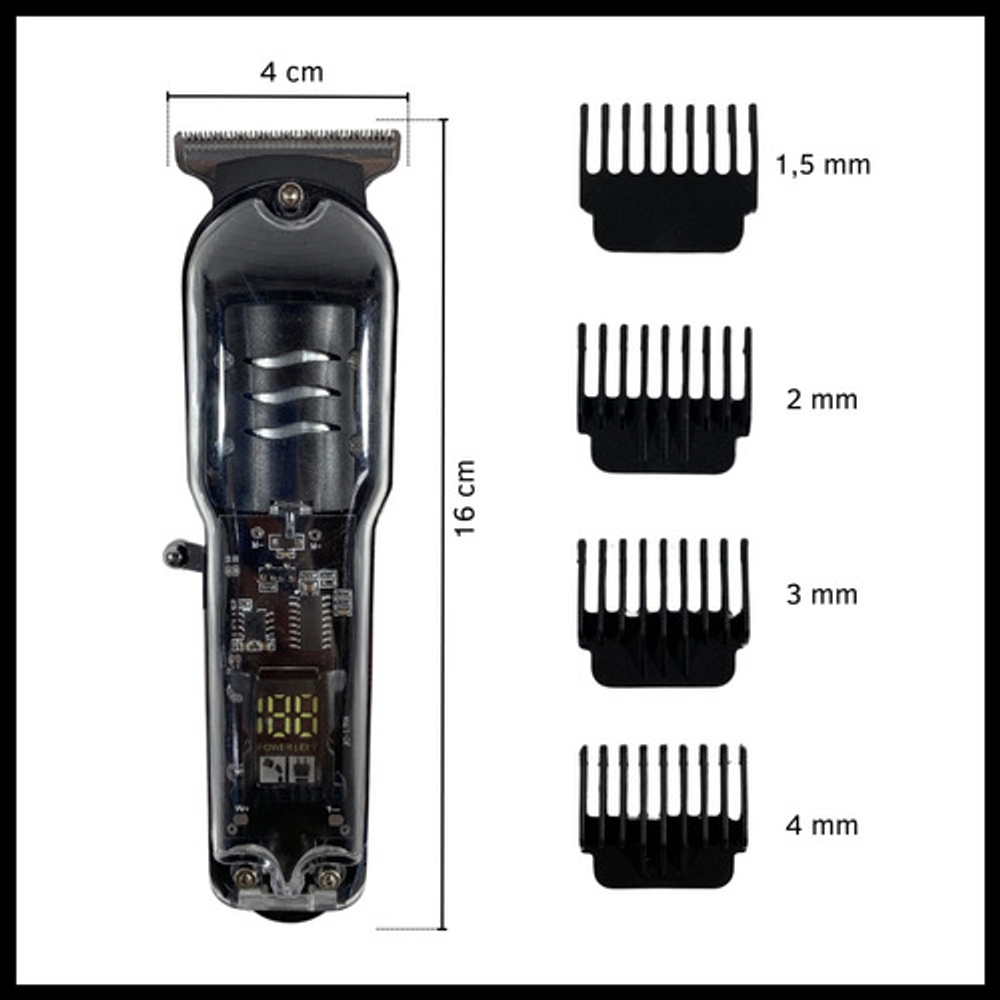 Características: -Potencia: 5W. -Display indicador de carga. -Peines de corte intercambiables. -Batería recargable a través de USB. -Visor transparente de carga.