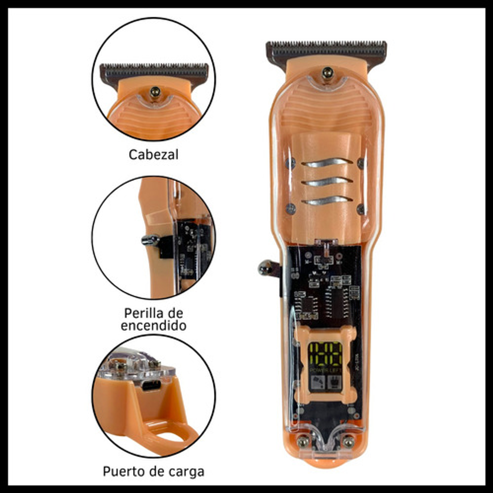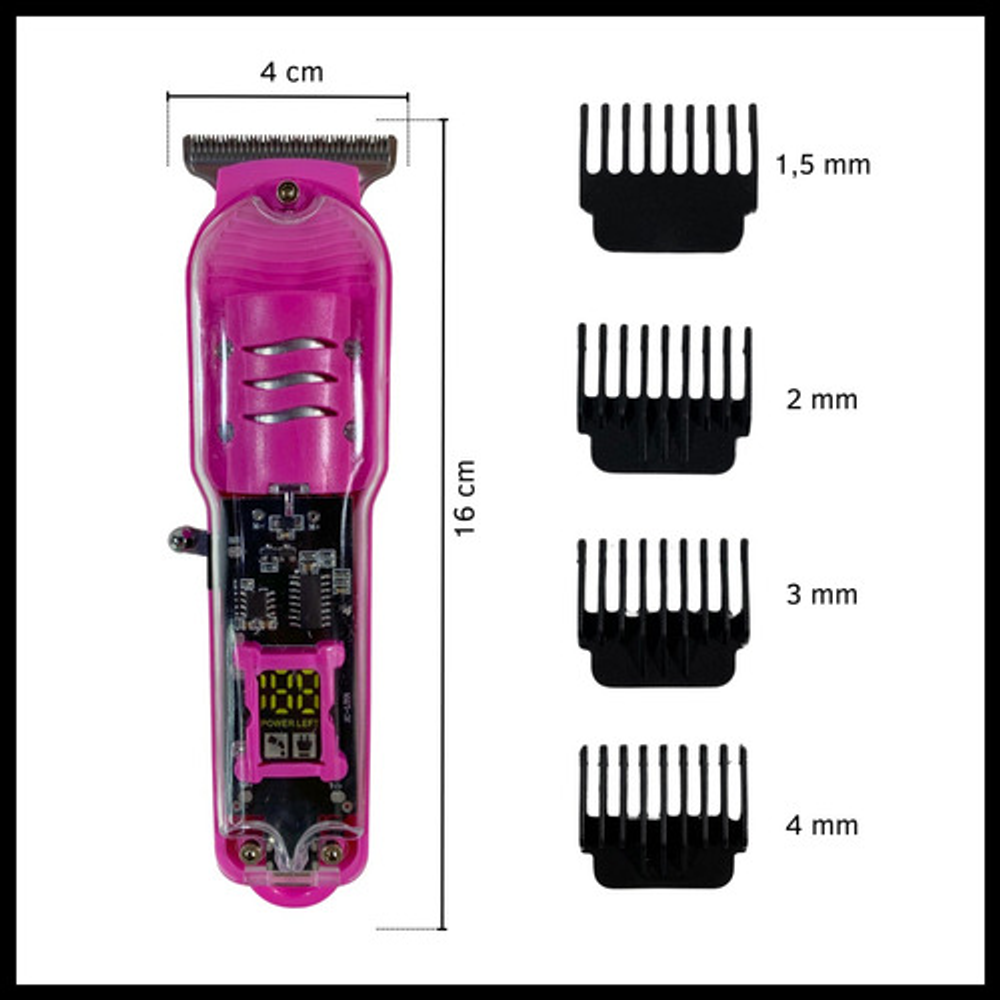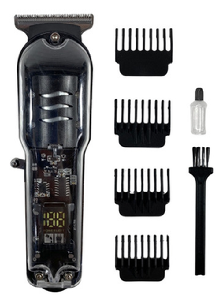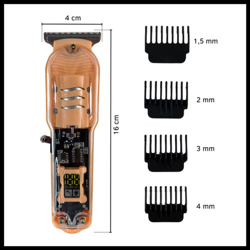 Características: -Potencia: 5W. -Display indicador de carga. -Peines de corte intercambiables. -Batería recargable a través de USB. -Visor transparente de carga.