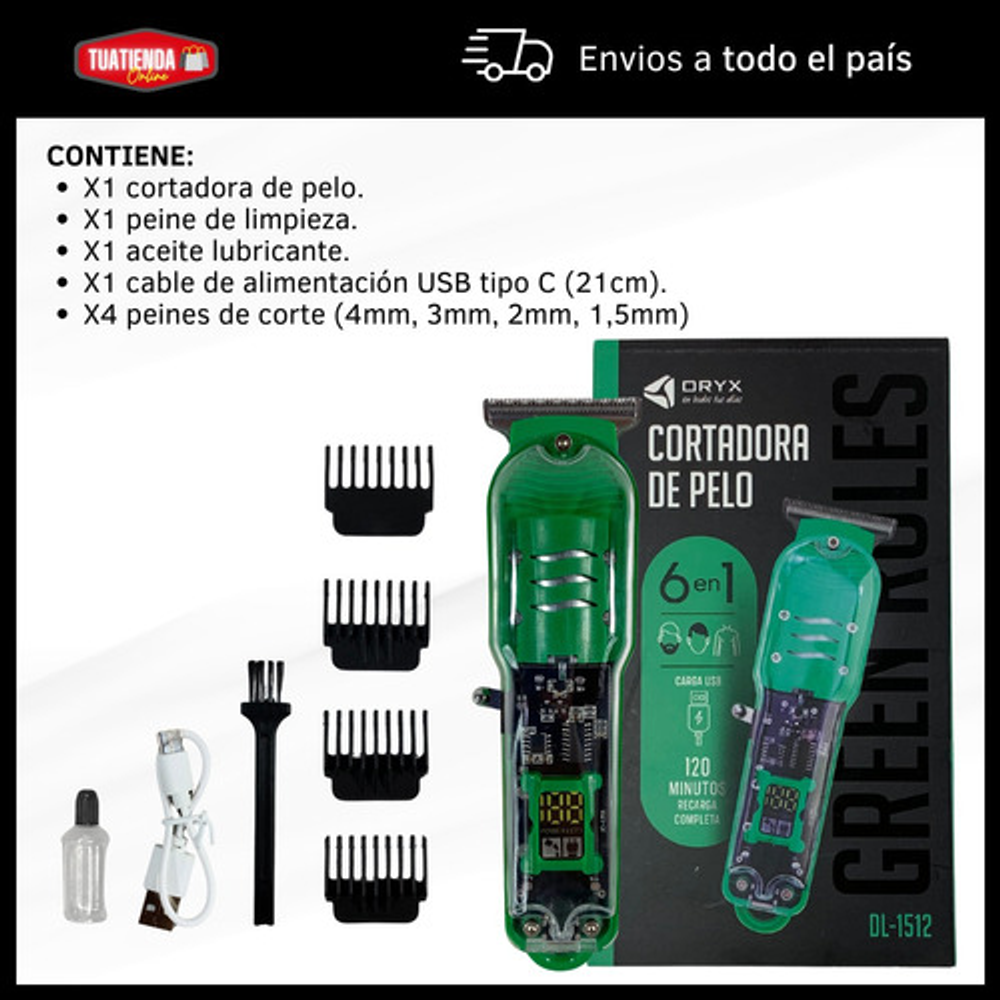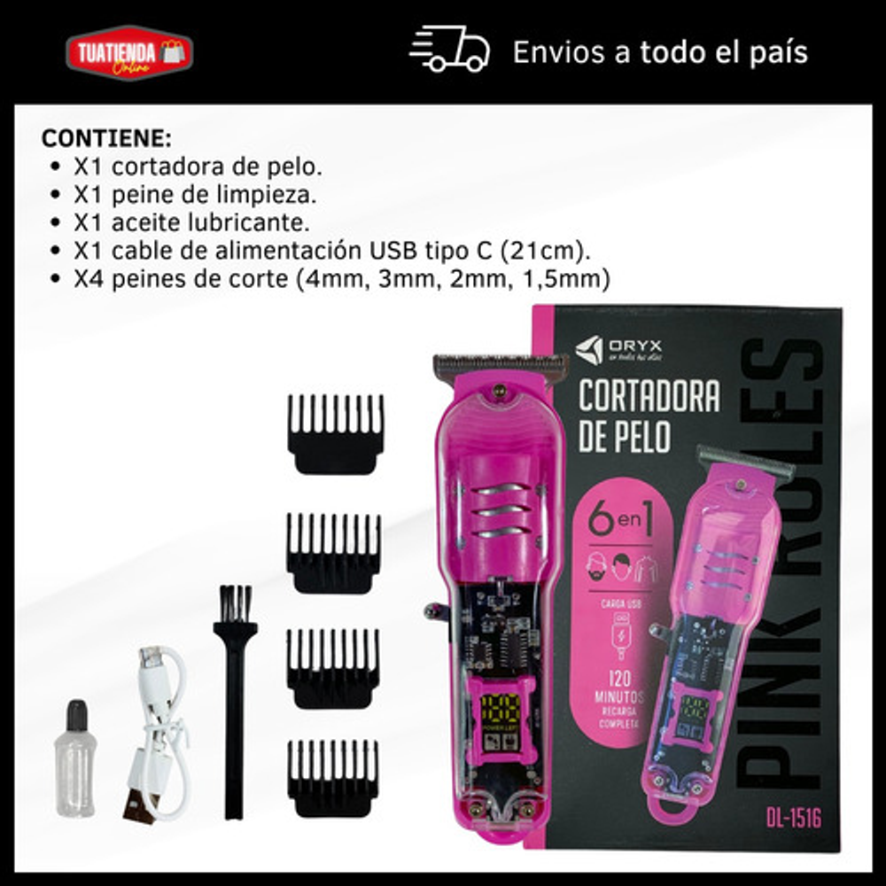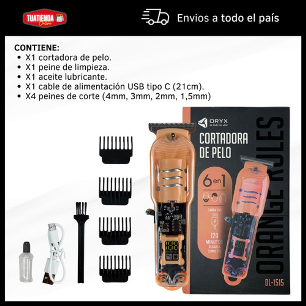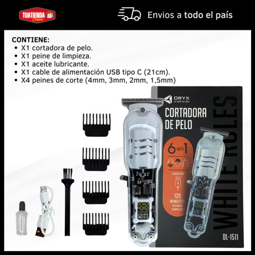 Incluye: -Aceite lubricante. -4 peines de corte. -Peine de limpieza. -Maquina cortadora de pelo. -Cable de alimentación USB.
