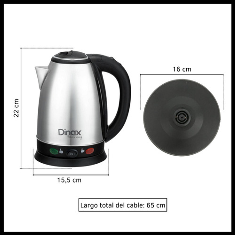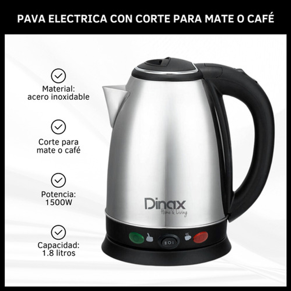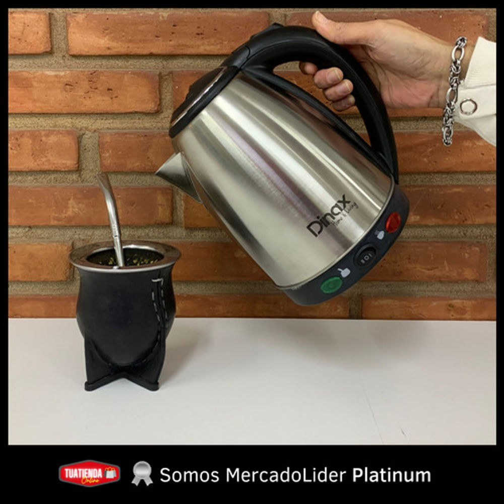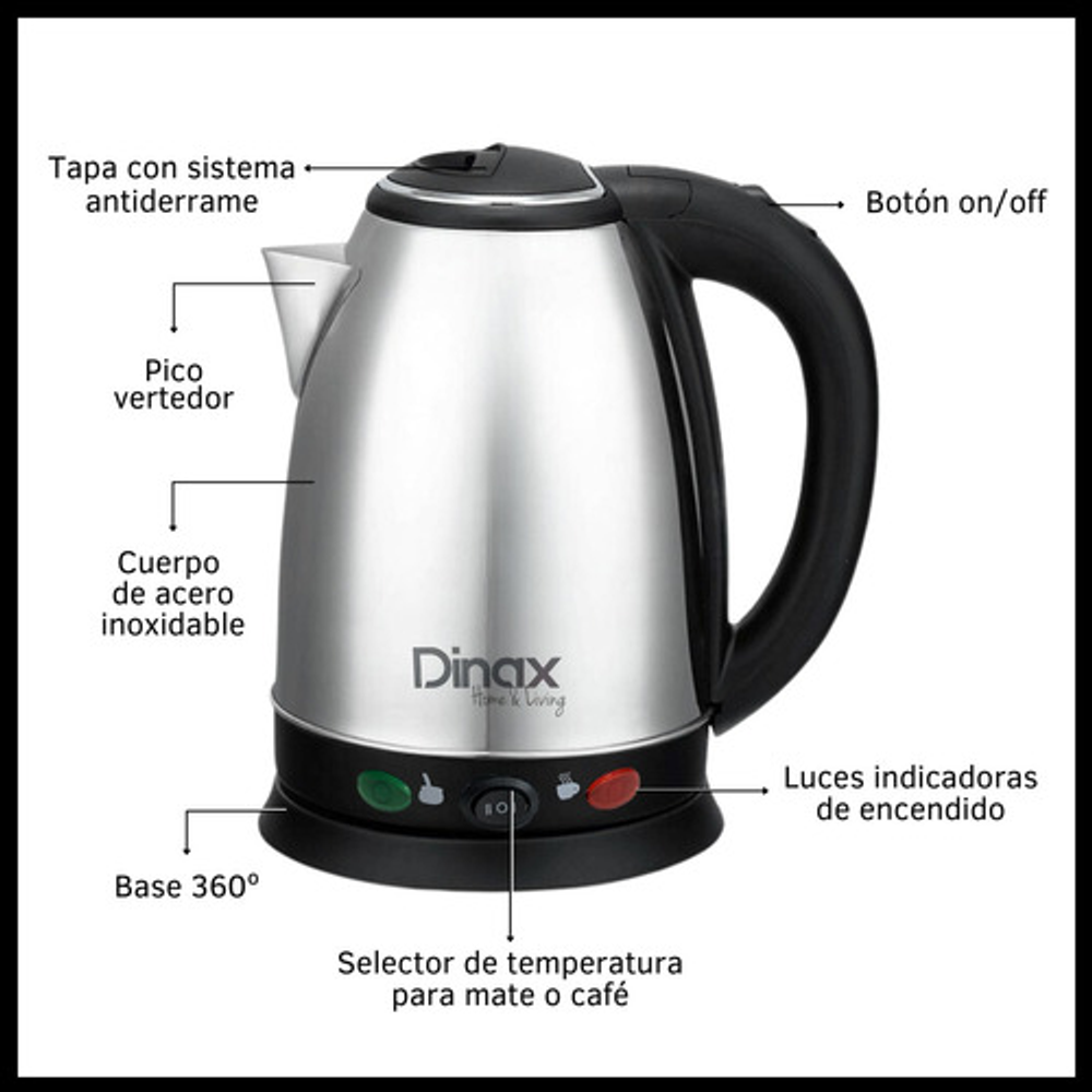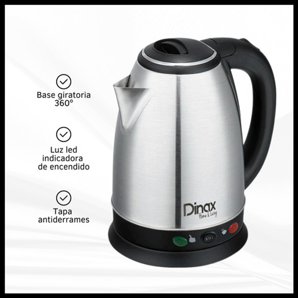 CARACTERISTICAS: -Tiene dos temperaturas: mate o café. -Luz indicadora de encendido. -Material: acero inoxidable. -Base giratoria 360°. -Corte automático. -Potencia: 1500W. -Capacidad: 1.8 lts.