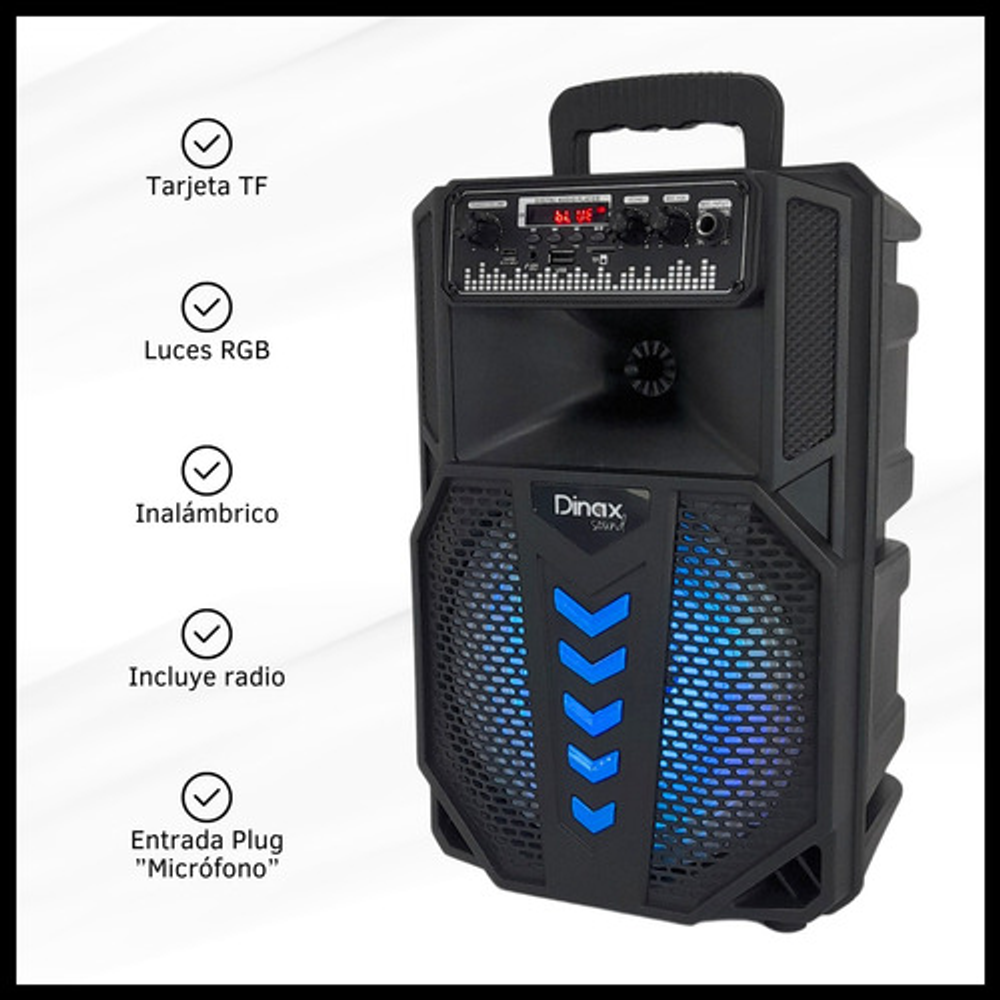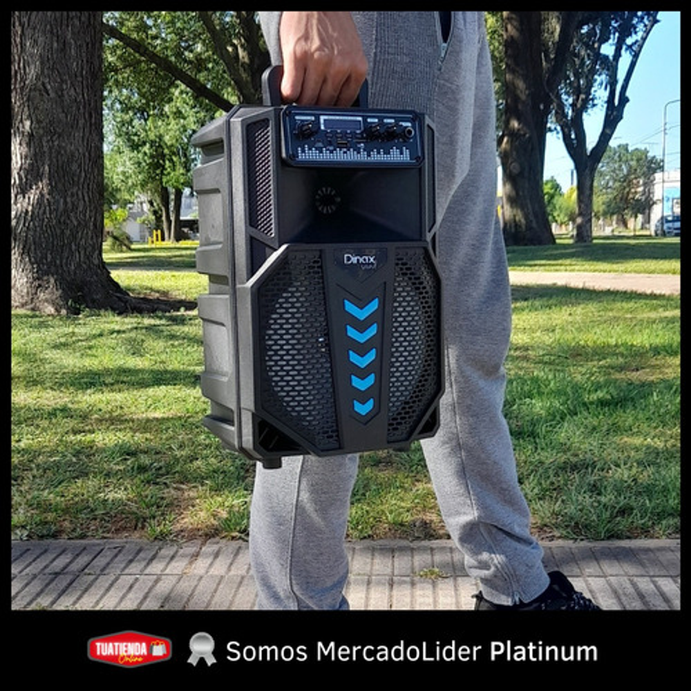 PARLANTE PORTATIL RITMO: https://articulo.mercadolibre.com.ar/MLA-1266340541-parlante-portatil-ritmo-300w-luces-colores-usb-radio-dinax-_JM