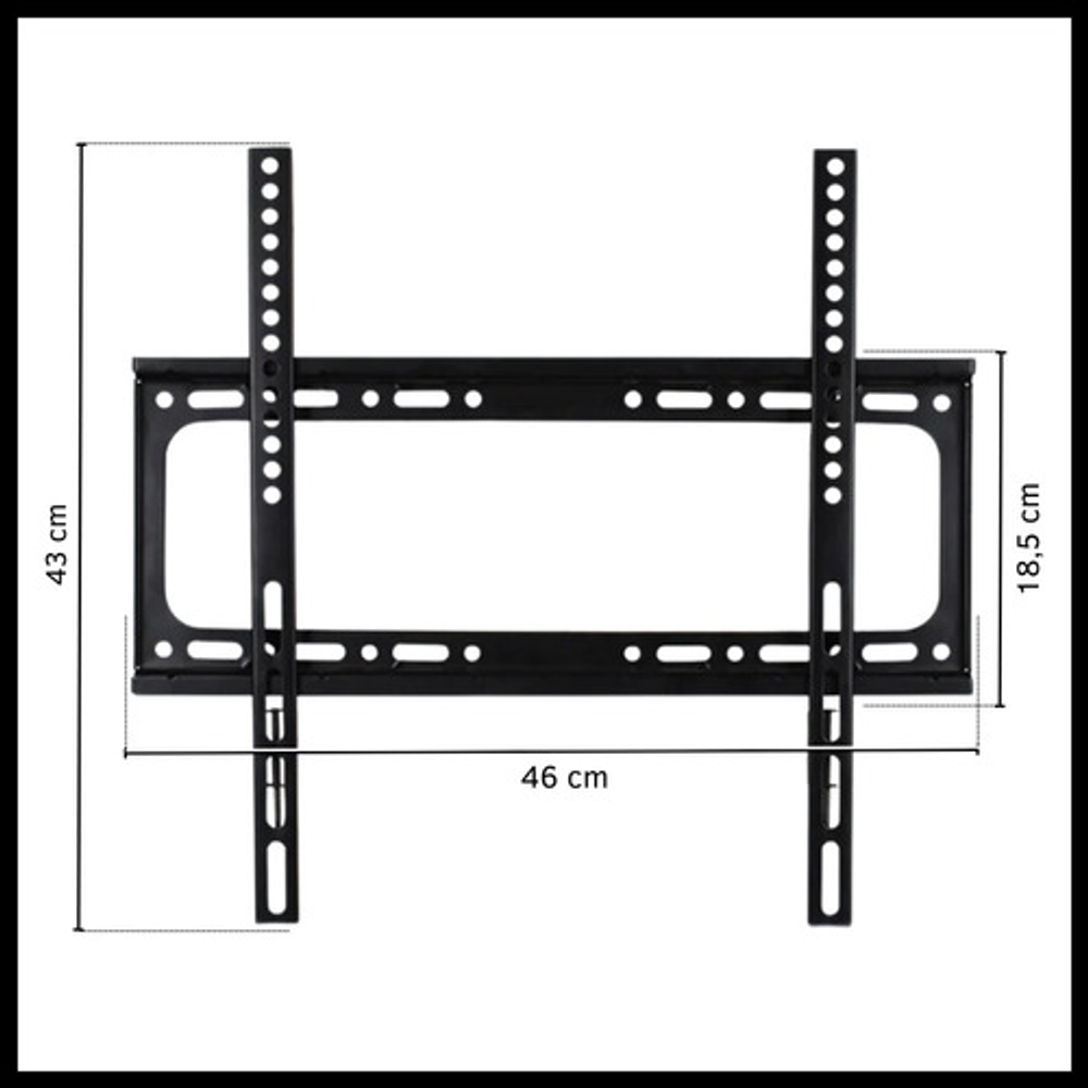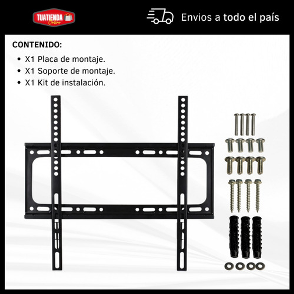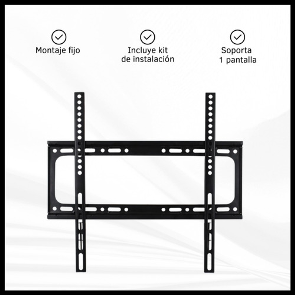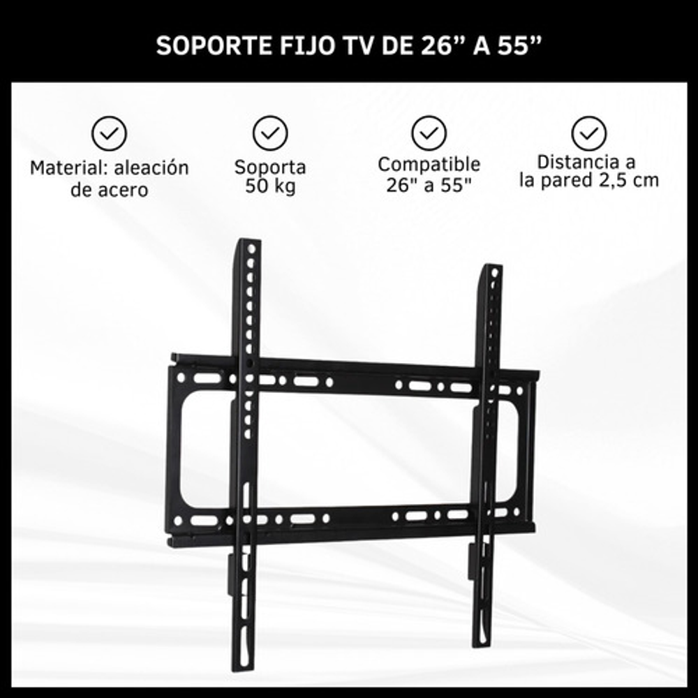 Características: -Distancia mínima a la pared de 2.5 cm. -Fabricado en aleación de acero. -Incluye kit de instalación. -Soporta hasta 50 kg. -Soporta de 26”- 55” -Soporta 1 pantalla. -Montaje fijo.