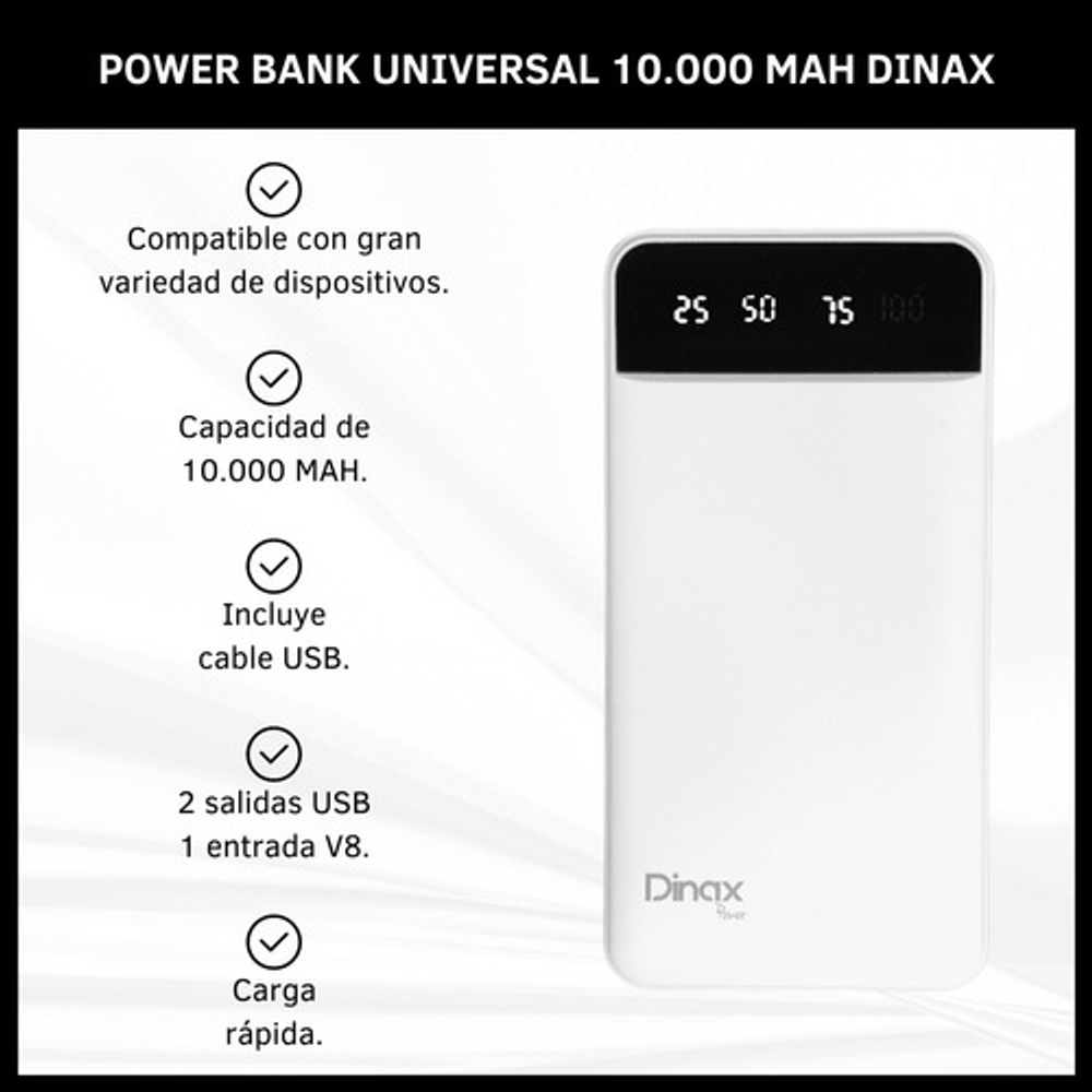 Características: • Carga rápida. • Capacidad de 10.000mah • Doble entrada USB y 1 entrada V8. • Incluye linterna. • Incluye cable de carga USB a V8. • Diseño compacto y liviano. • Compatible con una gran variedad de dispositivos.
