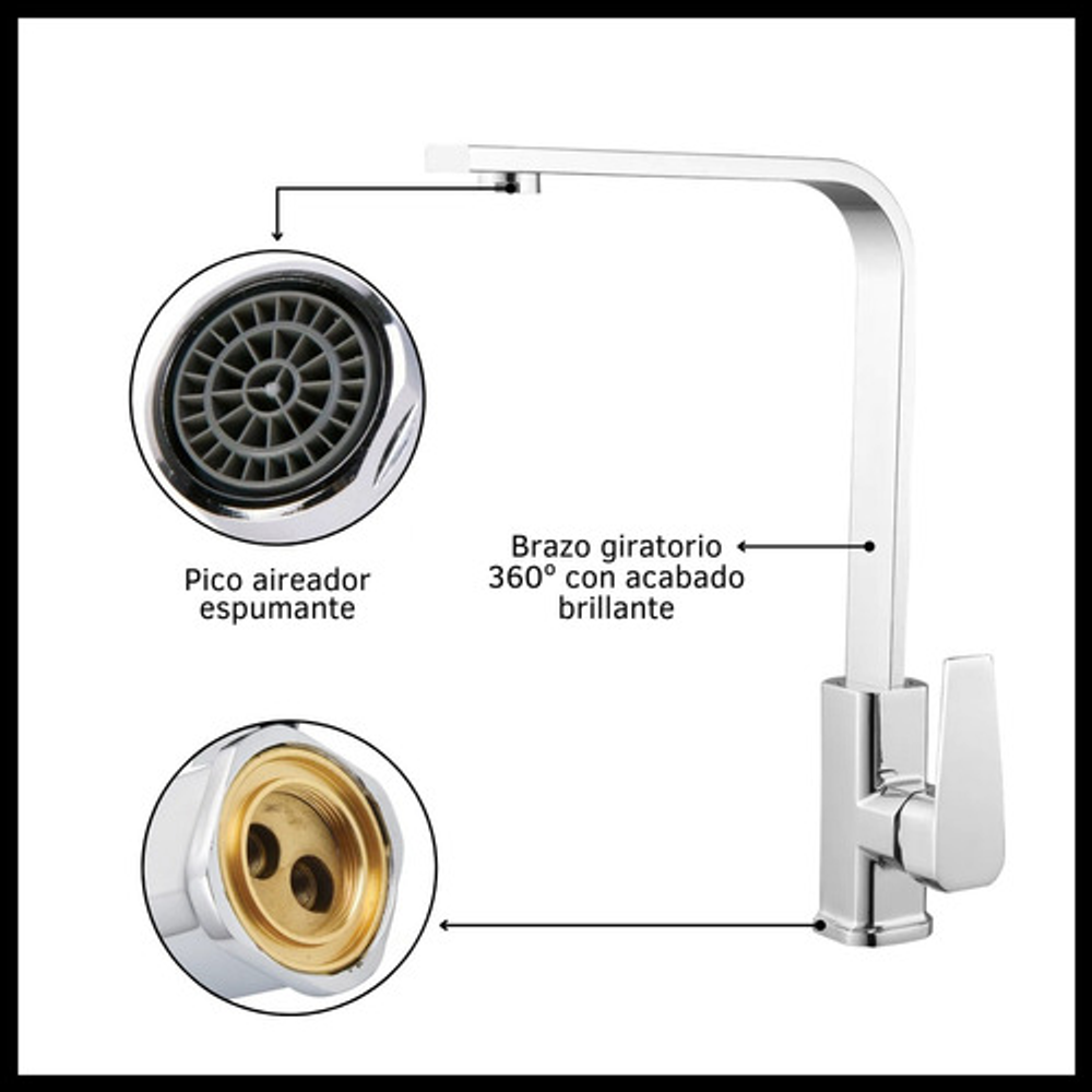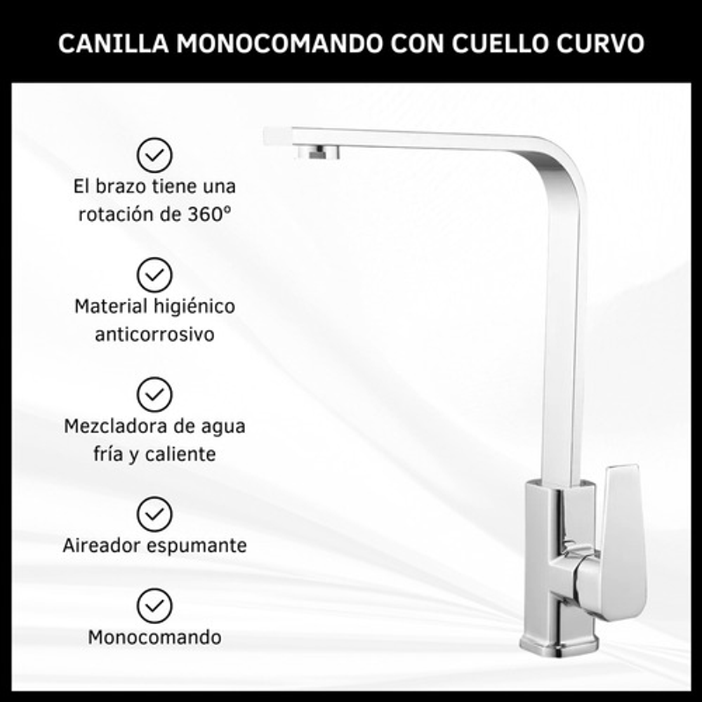Características: • Cuello curvo giratorio 360º. • Acabado brillante. • Mezclador de agua fría y caliente. • Incluye elementos de instalación. • Aireador espumante.