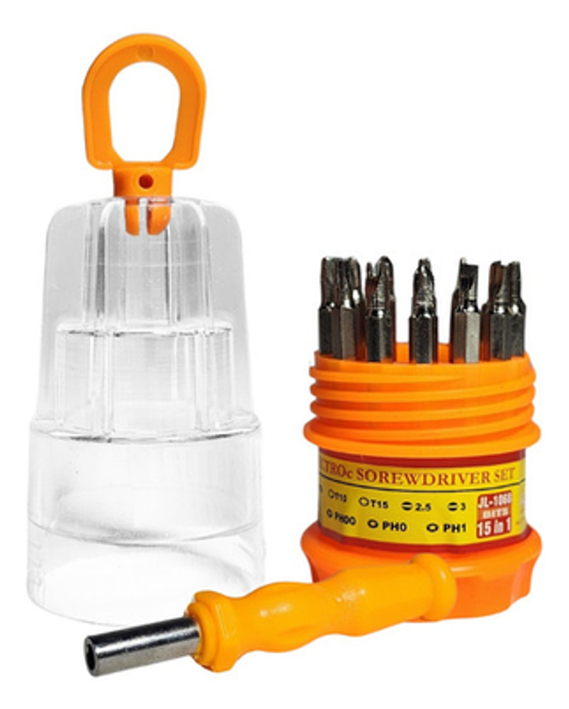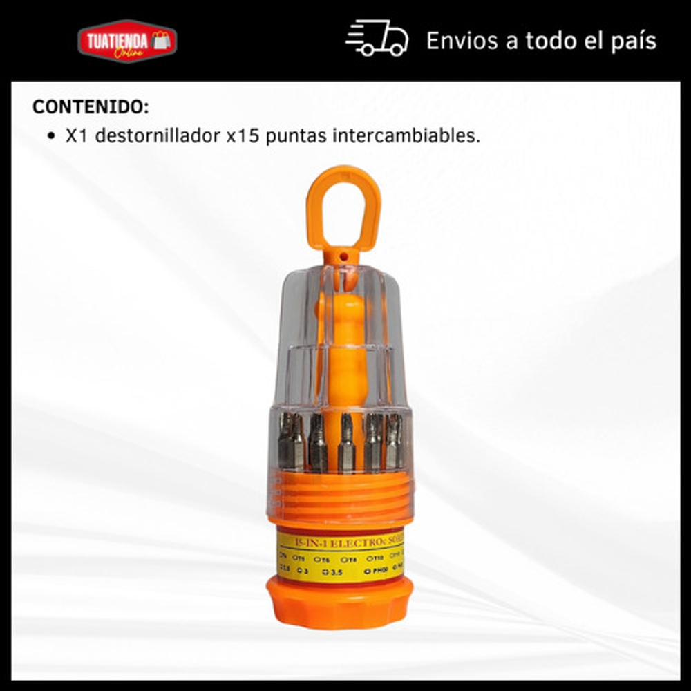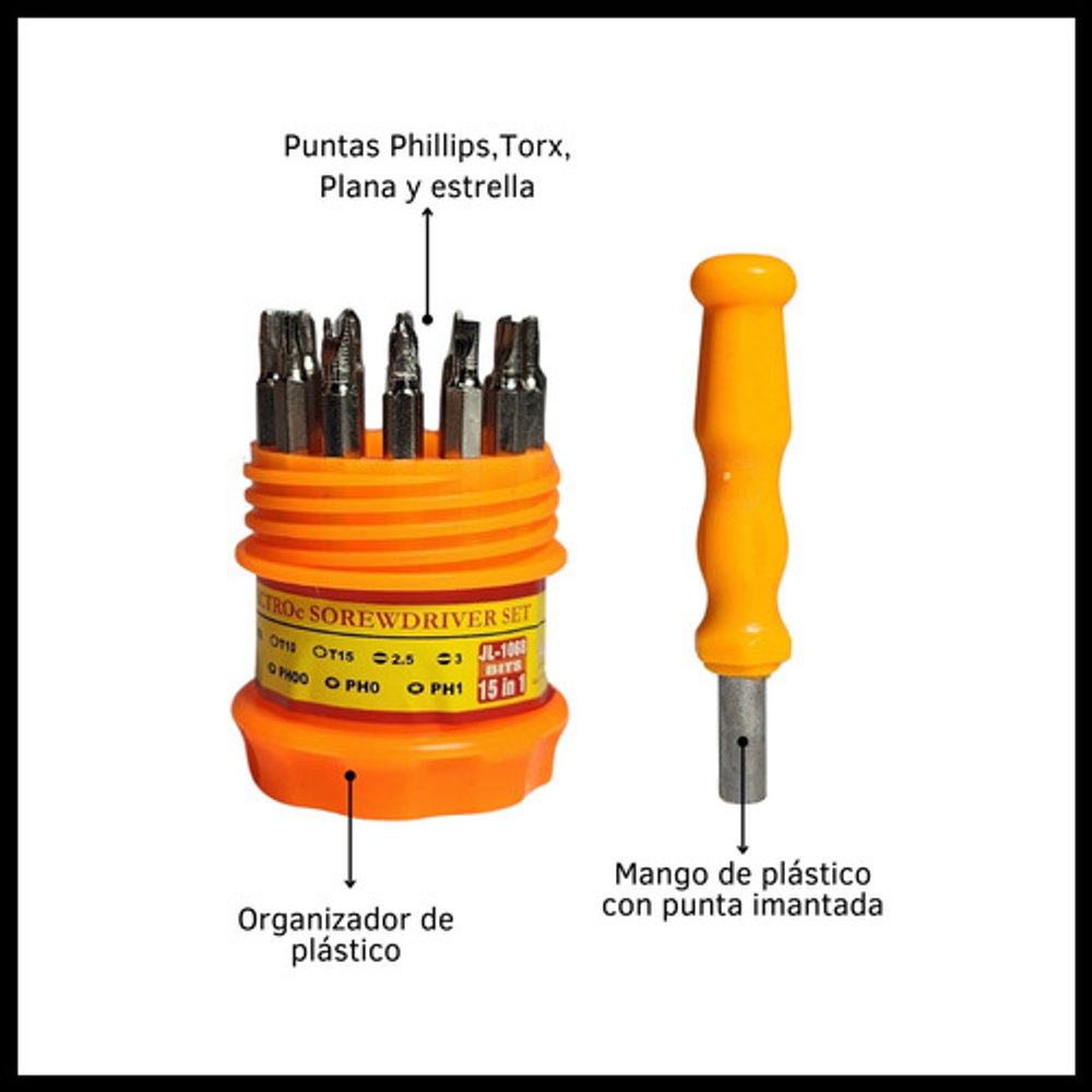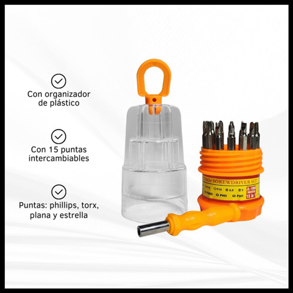 Características: • Medidas: -Torx: T4, T5, T6, T8, T10, T15. -Entrellas:PH00, PH1, PH1, -Phillips: 2.5, 3, 3.5. -Planas: 2.5, 3. • Incluye destornillador con 15 puntas intercambiables. • Ideal para arreglos de netbooks, celulares, etc. • Con organizador plástico y orificio para colgar. • Puntas Phillips, torx, plana y estrella. • Mango de plástico.