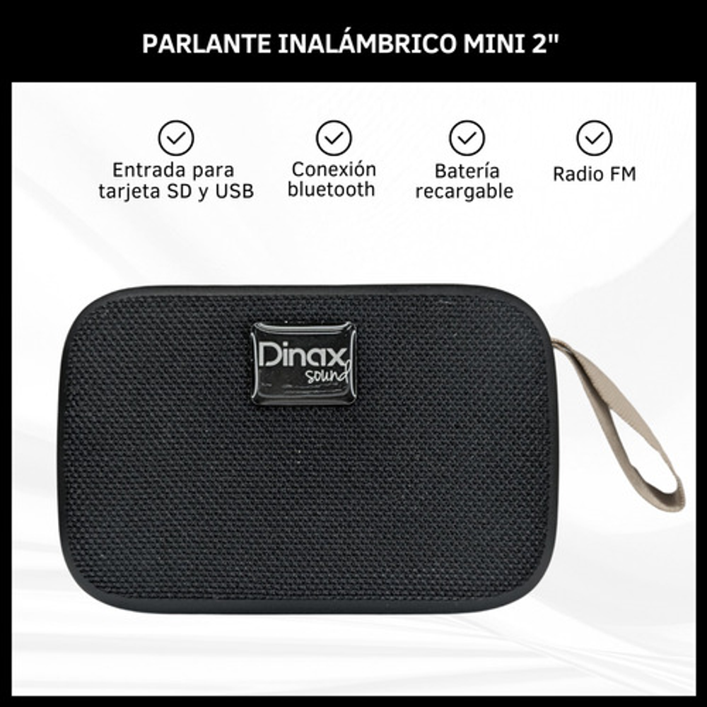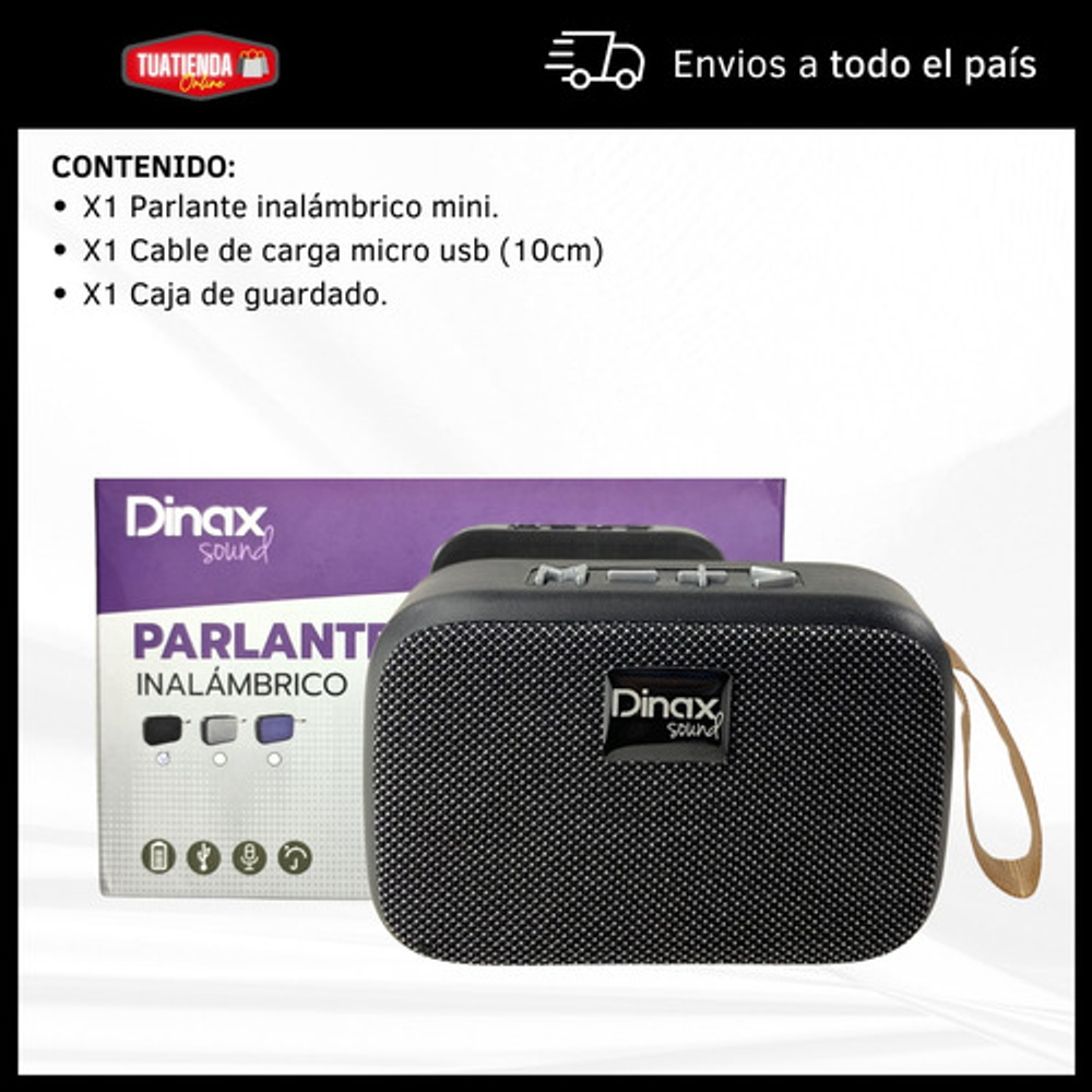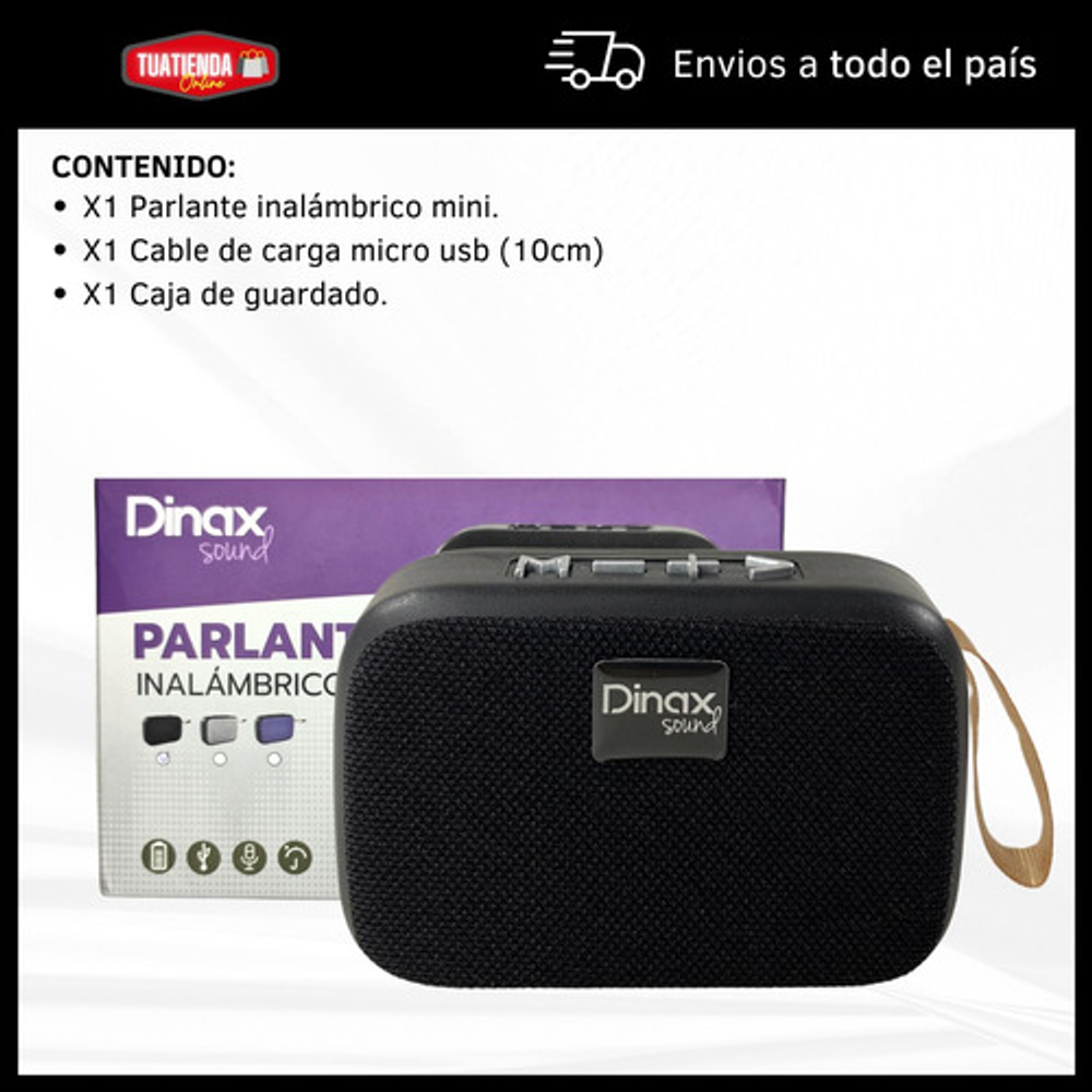 MINI PARLANTE PORTÁTIL DINAX: https://articulo.mercadolibre.com.ar/MLA-1552588784-parlante-mini-inalambrico-conexion-bluetooth-usb-sd-radio-fm-_JM