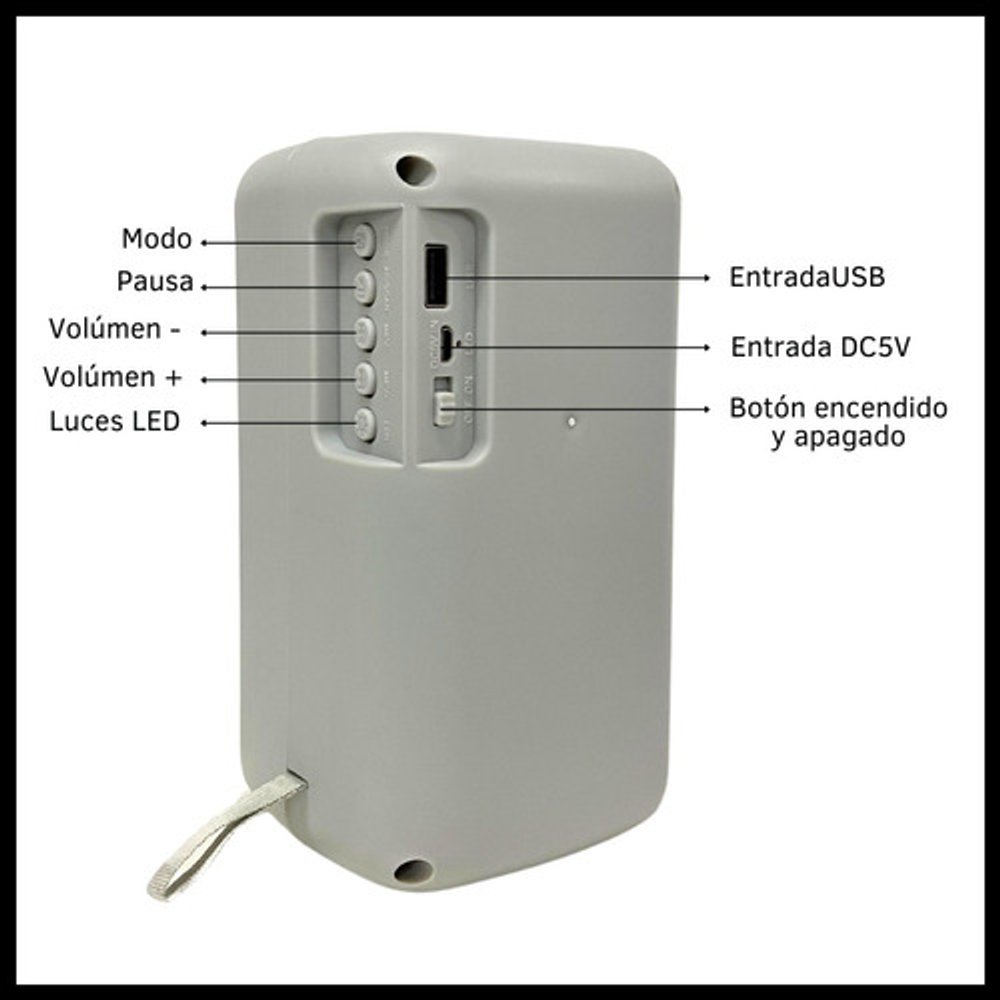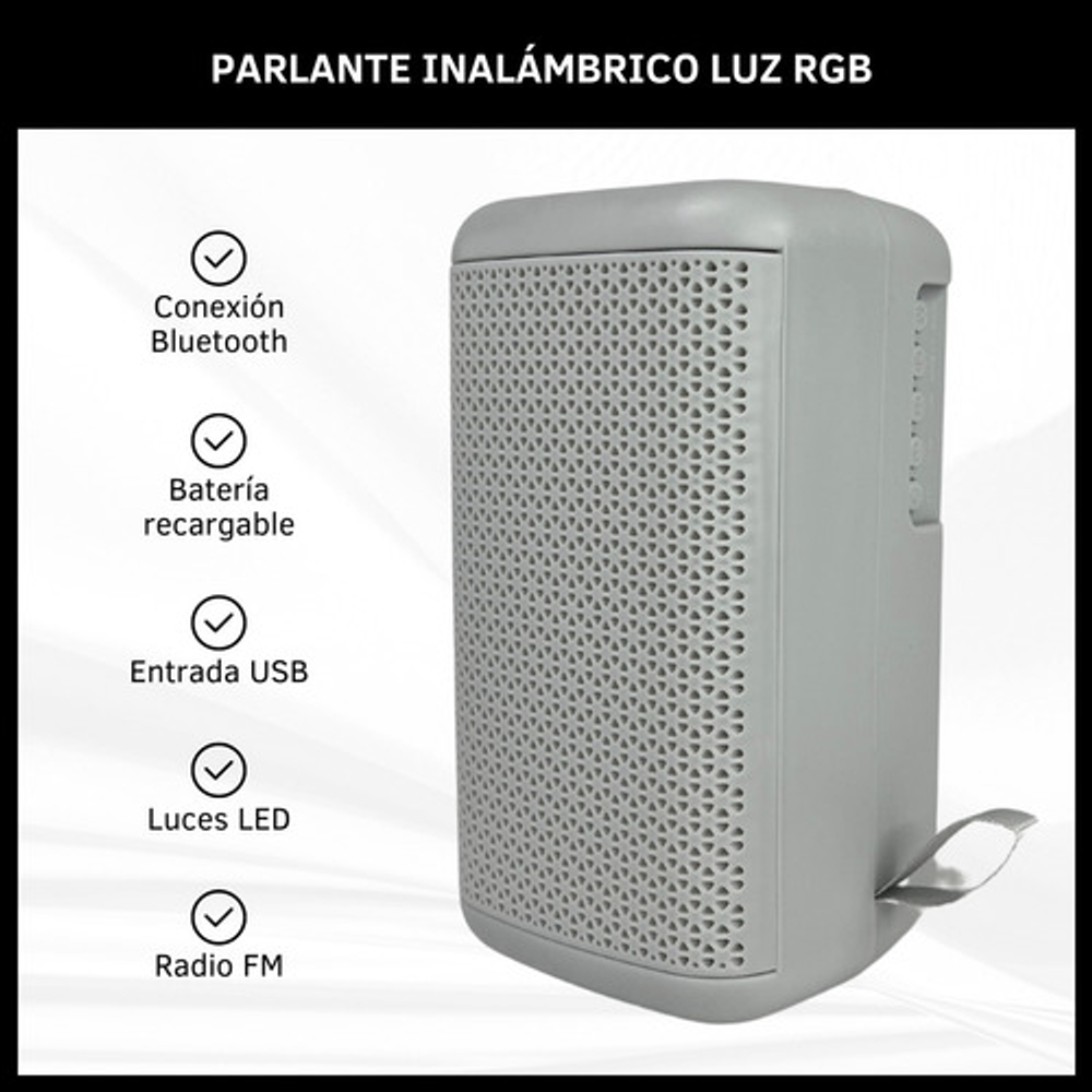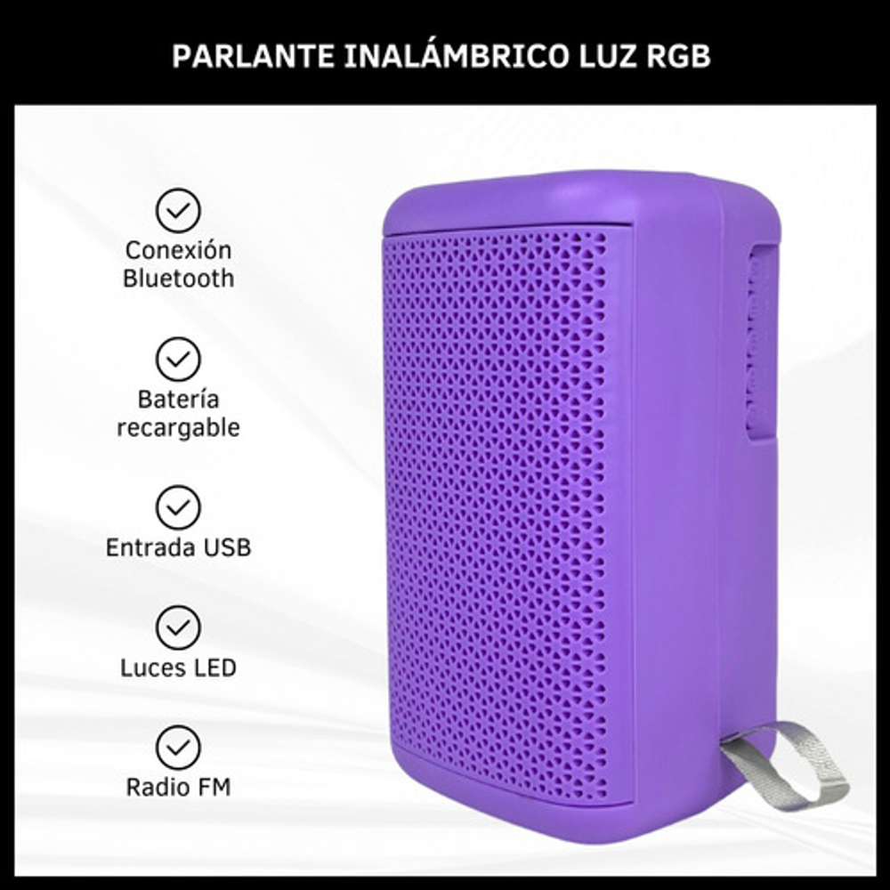 Características: • Cable USB de carga. • Conexión inalámbrica. • Batería recargable. • Incluye radio FM. • Entrada USB. • Luces led.